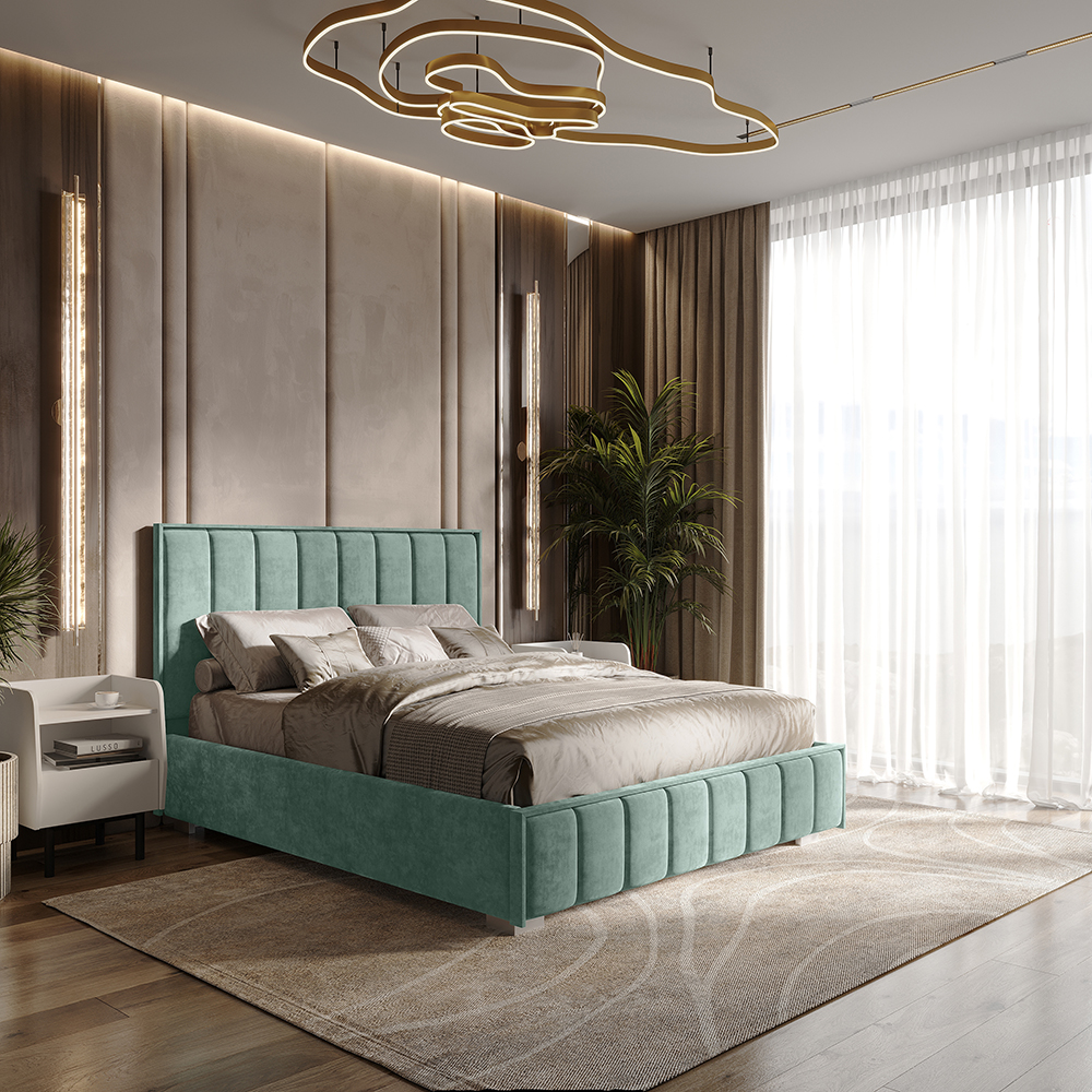 Изголовье, царги и изножье - это мягкие части кровати. Изголовье и изножье оформлены мягкими накладками, расцветка соответвует варианту исполнения. Ткань обивки - велюр.