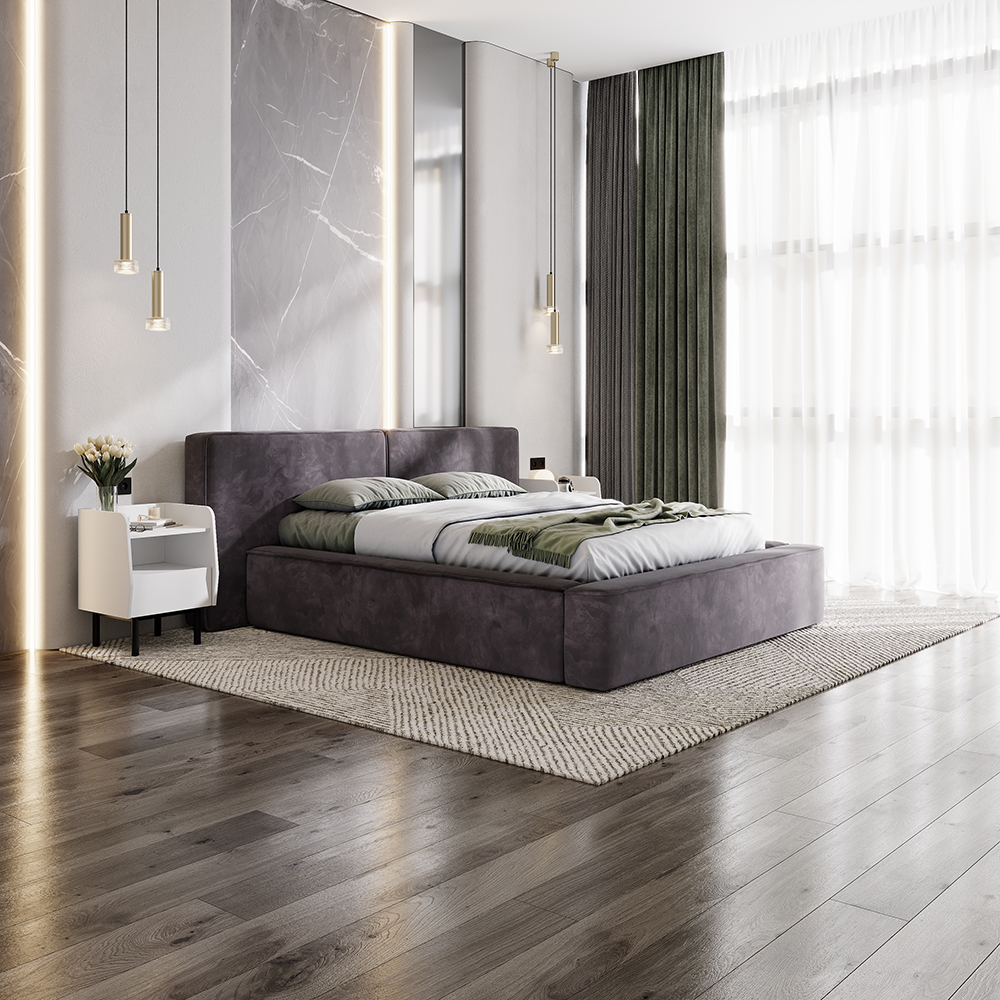 Материал мягких частей - велюр, искусственная замша. Декор изголовья и изножья - элегантный кант.