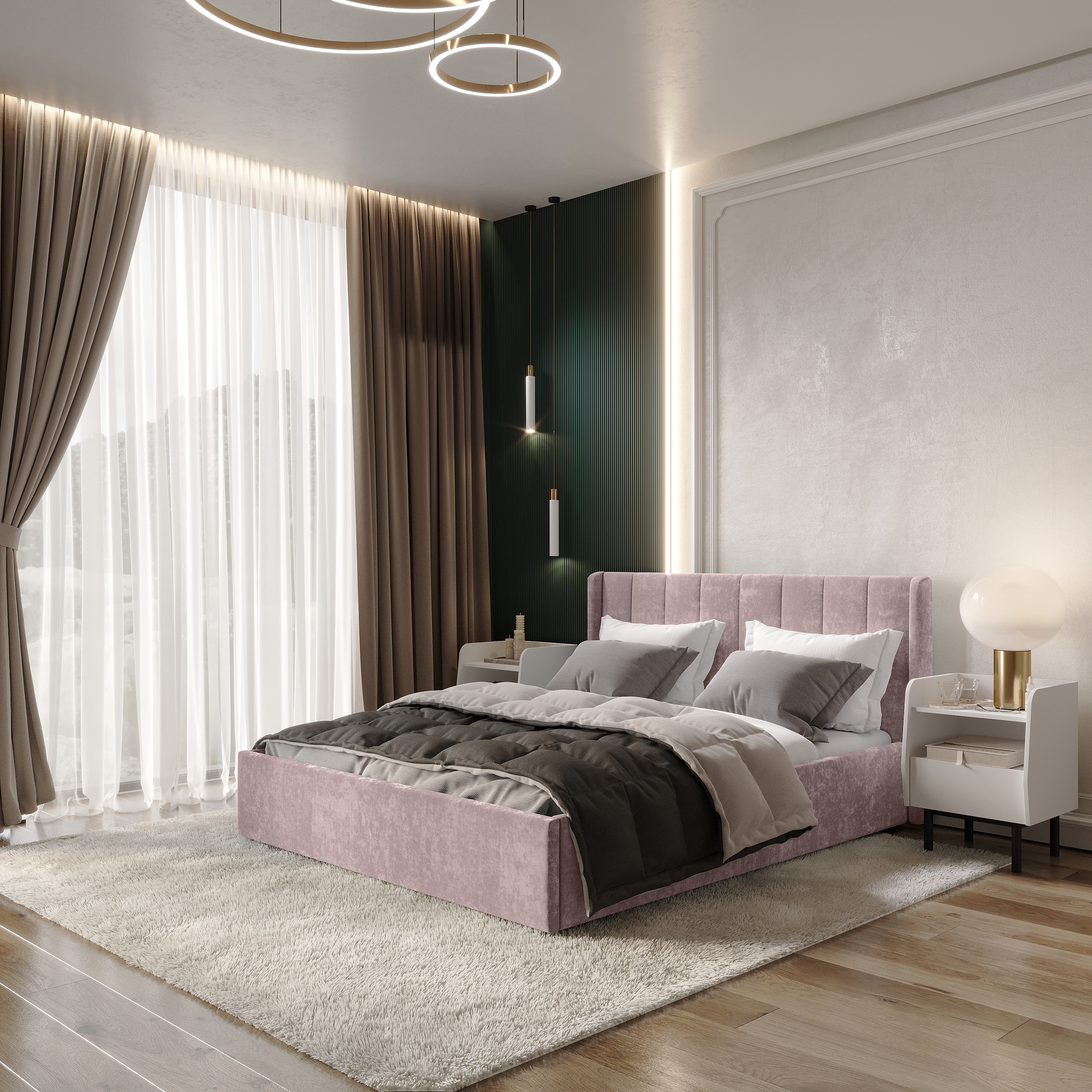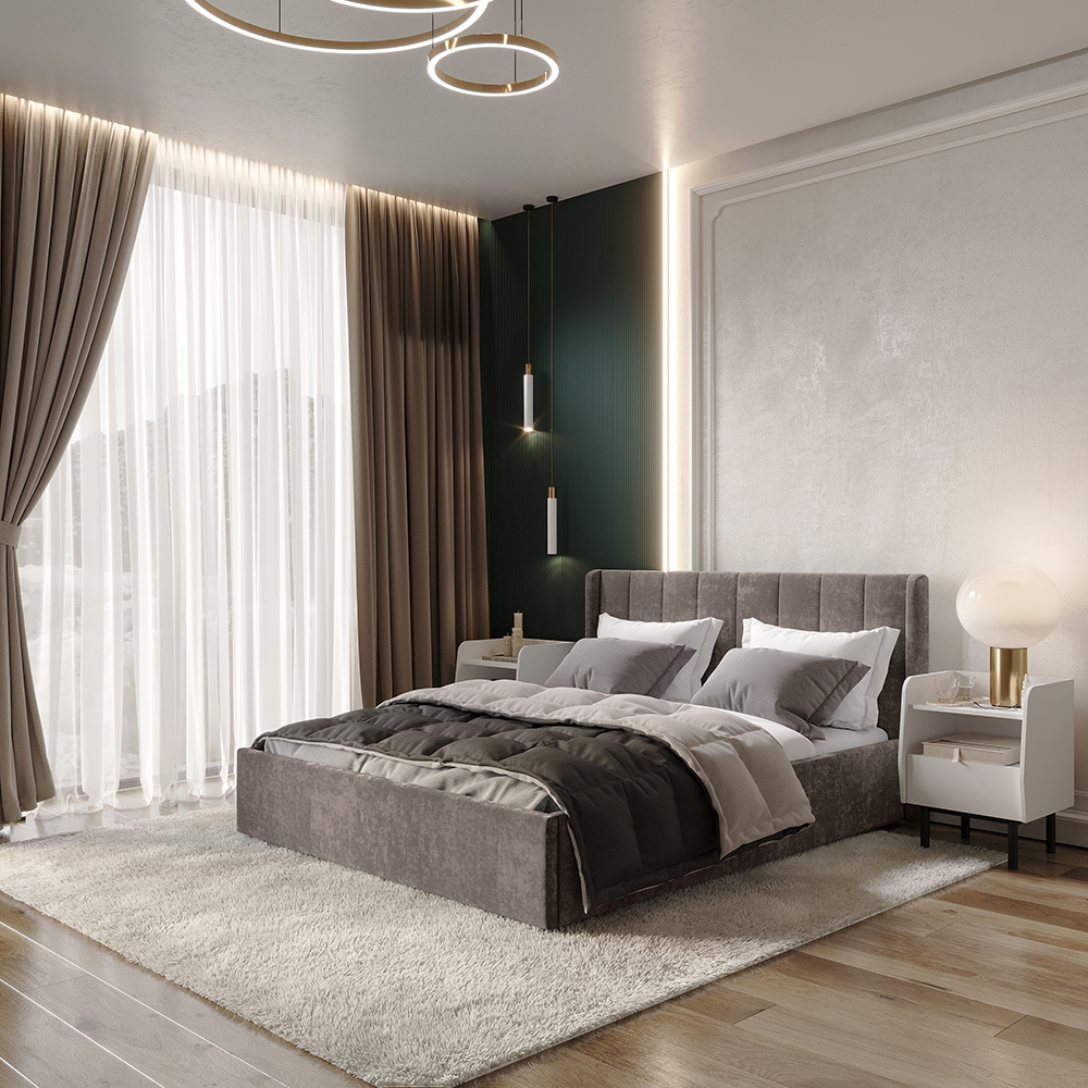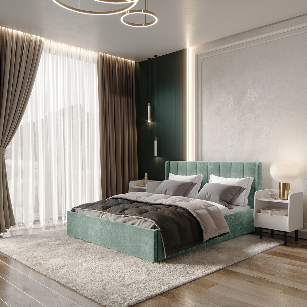 Материал мягких частей - велюр, задняя сторона - спанбонд серый. Декор изголовья - стежка.