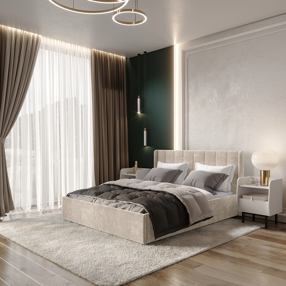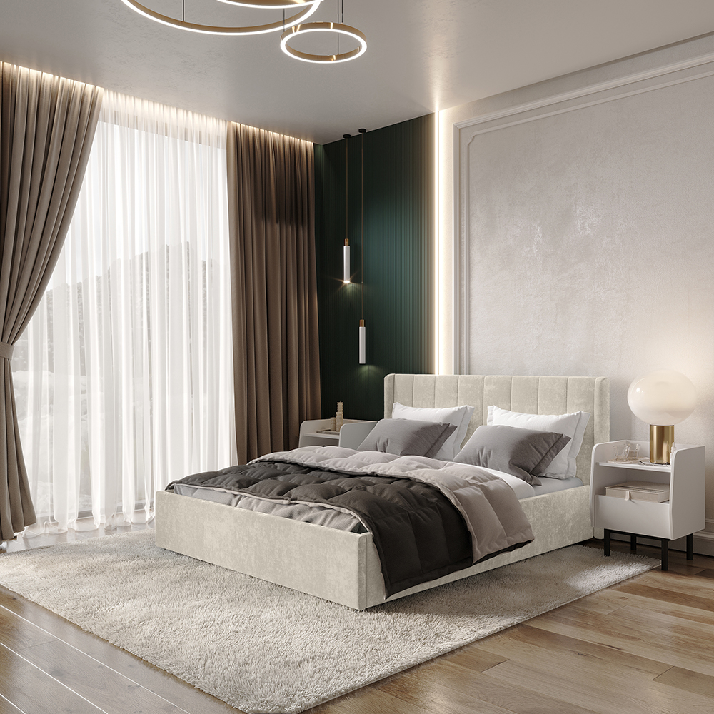 Кровать может комплектоваться ортопедическим основанием с подъемным механизмом, ЛДСП настилом, ДСП проложками или реечным настилом. Также может комплектоваться опорами "звезда" в золотом или черном цвете. Любое из этих оснований и опоры приобретаются отдельно. Место под ортопедическое основание - 1404*2010 мм.