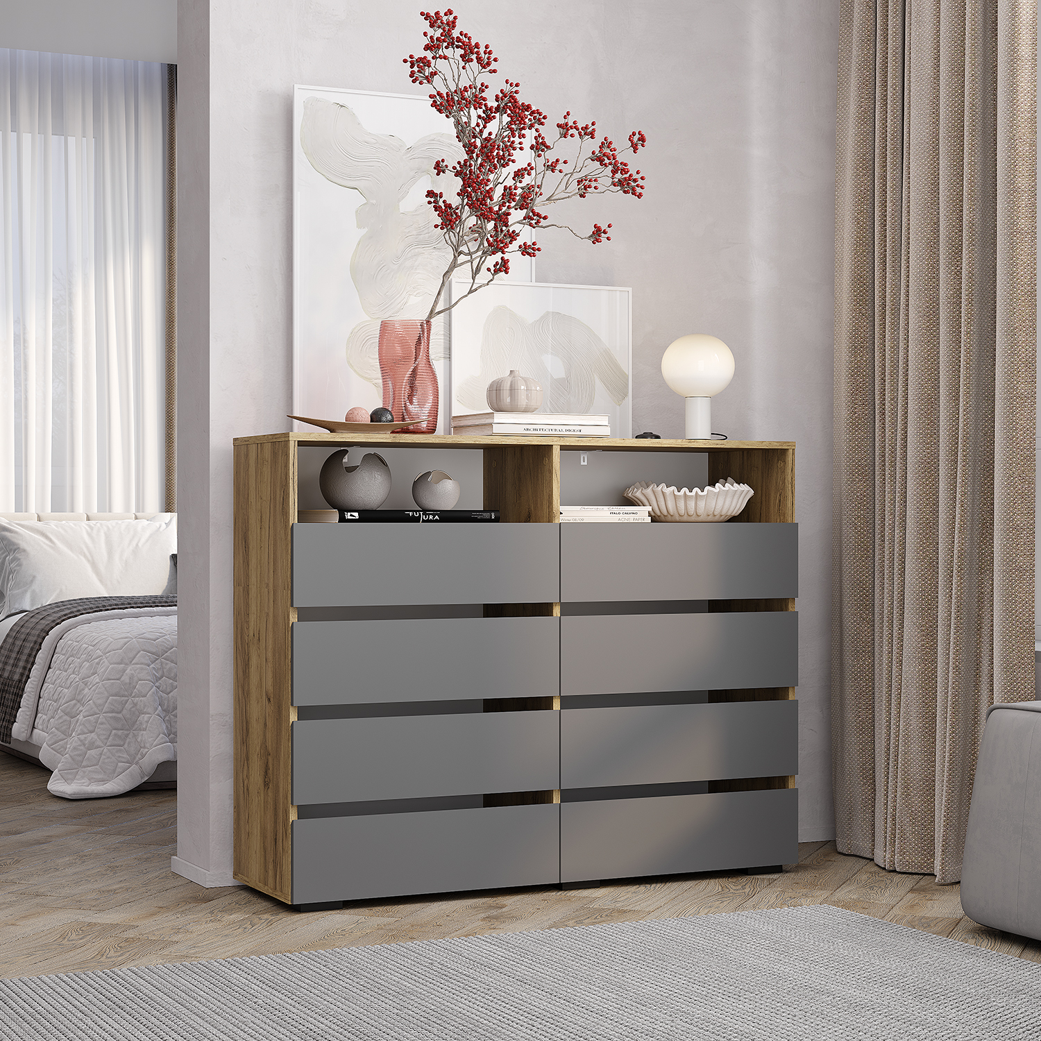 "Твист" - это стильное решение в трендовой цветовой гамме, которое идеально дополнит современные интерьеры в стиле "лофт" и "неоклассика". Компактные модули оснащены всеми необходимыми зонами хранения. Матовое покрытие - не только эстетичная, но и практичная деталь, на которой незаметны отпечатки. Геометрическая конструкция модели подойдет для разных пространств. Зеркало с еврокромкой сделает подготовку к выходу комфортной и удобной. Комод будет одинаково органично смотреться в гостиной, прихожей и спальне. В качестве альтернативы лицевой фурнитуре на фасадах сделаны эргономичные интегрированные срезы.
