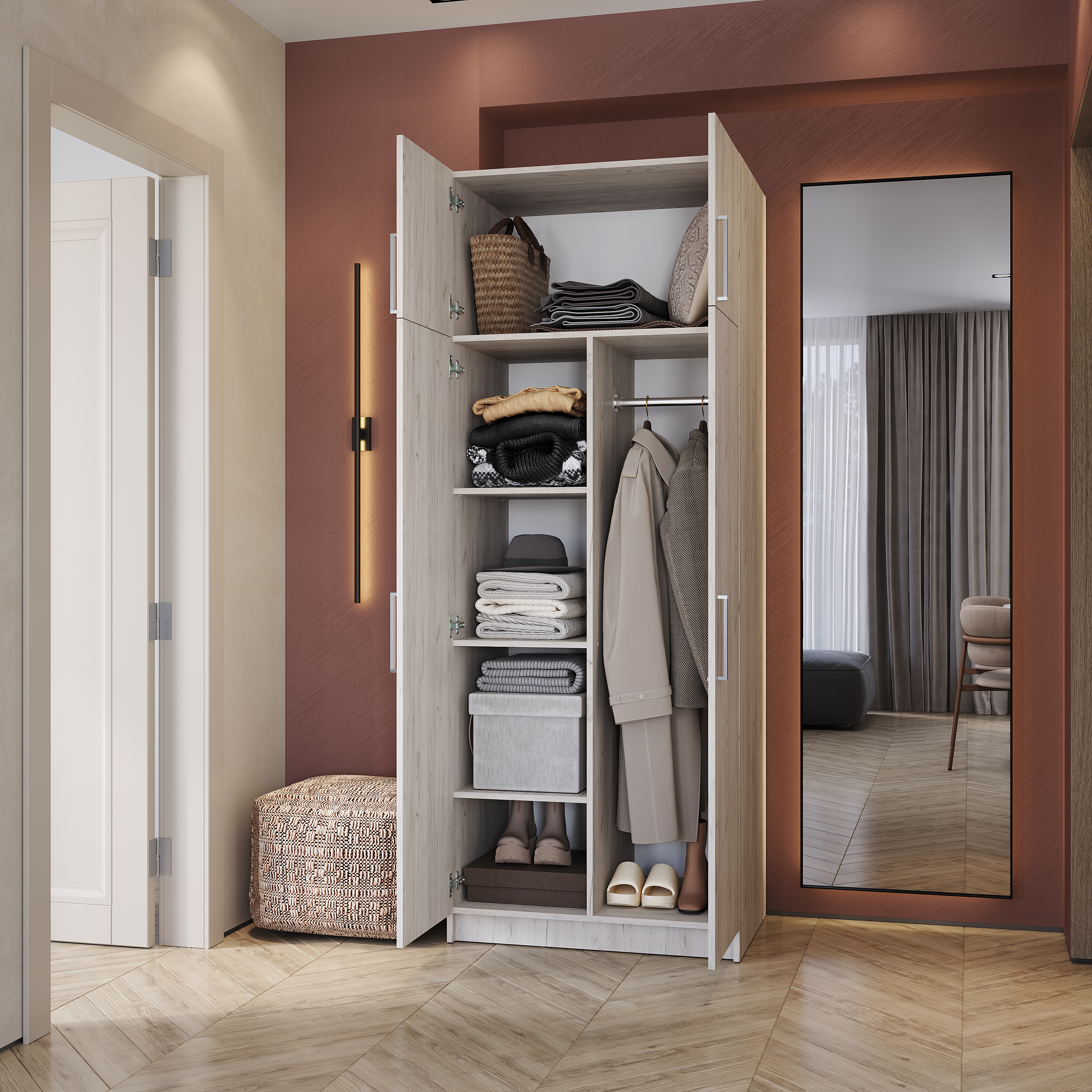 Функциональный двухстворчатый шкаф справится с размещением большого количества предметов одежды и аксессуаров. Модель разделена на две зоны, каждая из которых оснащена распашными дверцами, в большей части находятся полки и отделение с хромированной штангой. Часть поменьше представляет собой вместительную нишу для хранения.