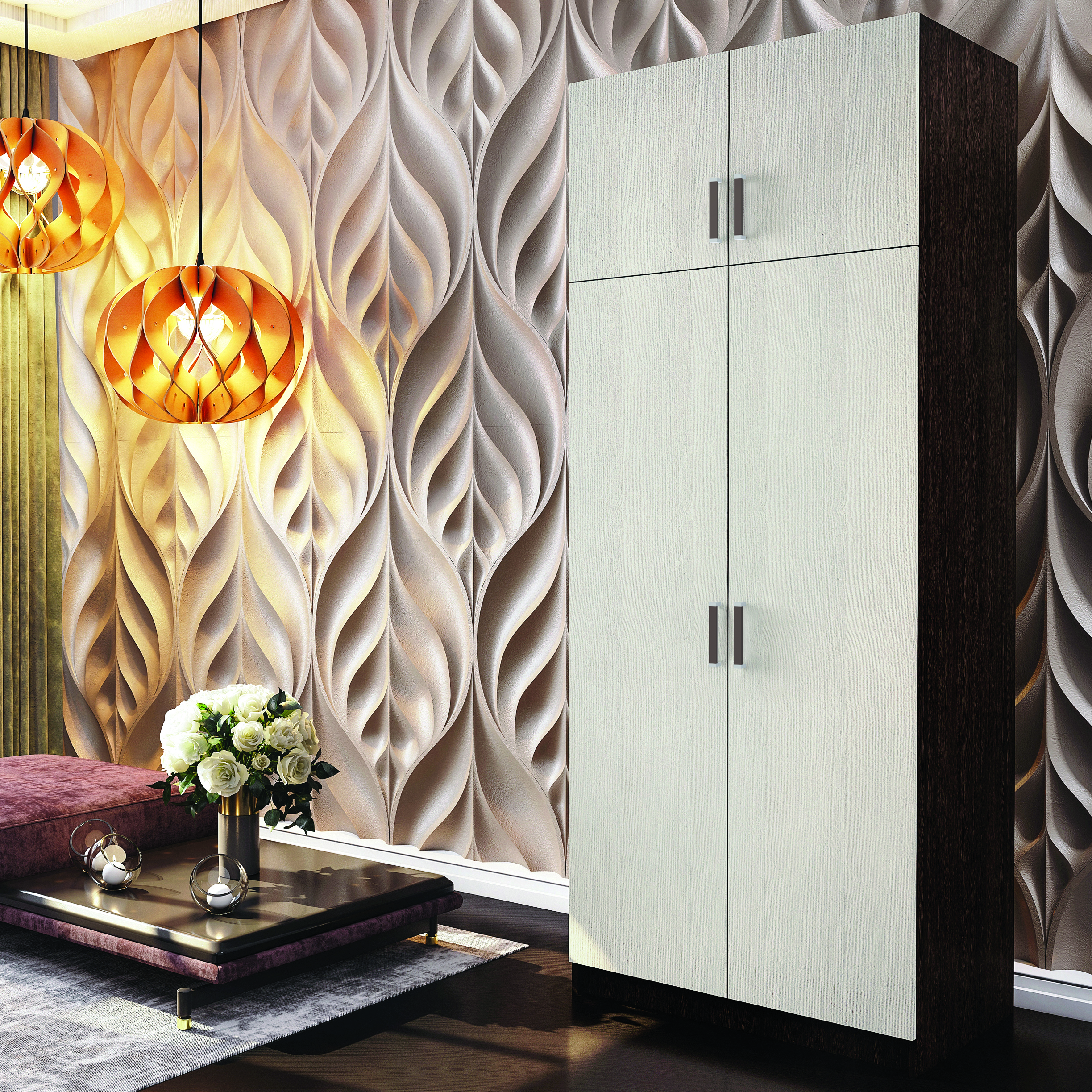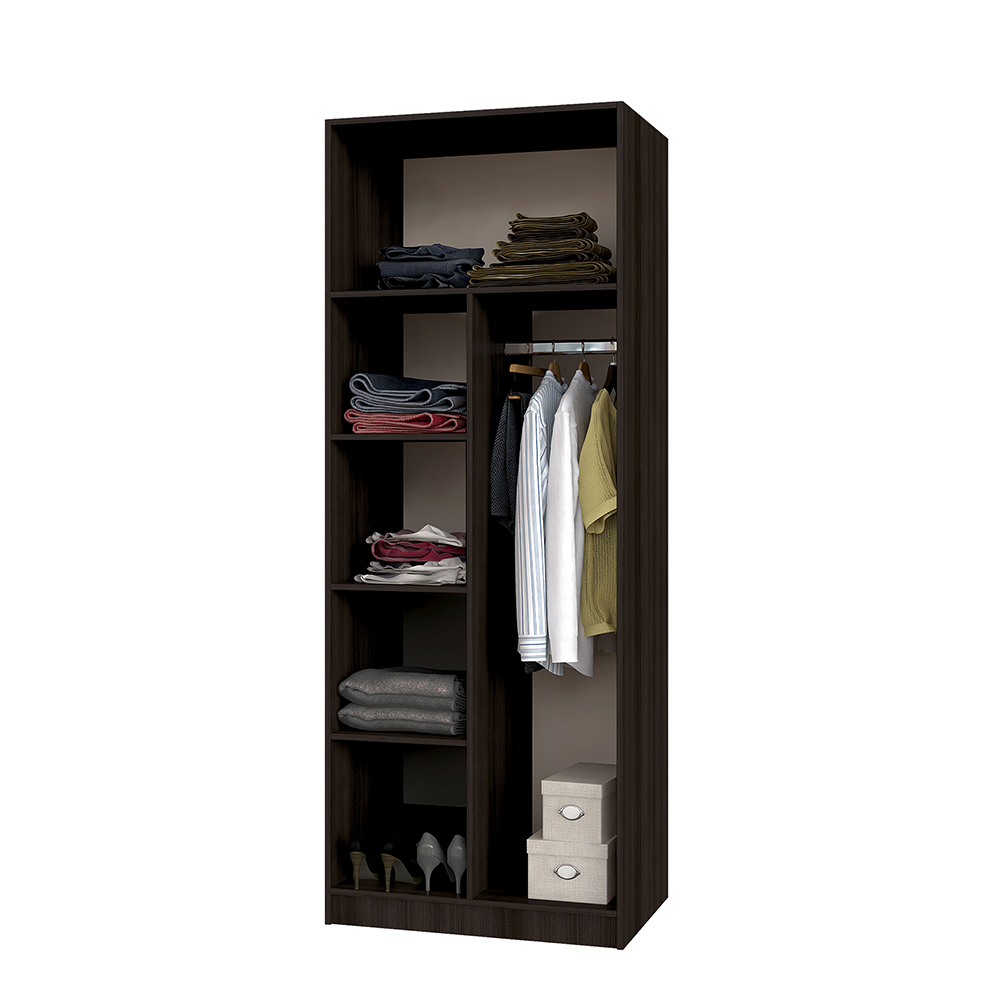 Функциональный двухстворчатый шкаф справится с размещением большого количества предметов одежды и аксессуаров. Модель разделена на две зоны, каждая из которых оснащена распашными дверцами, в большей части находятся полки и отделение с хромированной штангой. Часть поменьше представляет собой вместительную нишу для хранения.