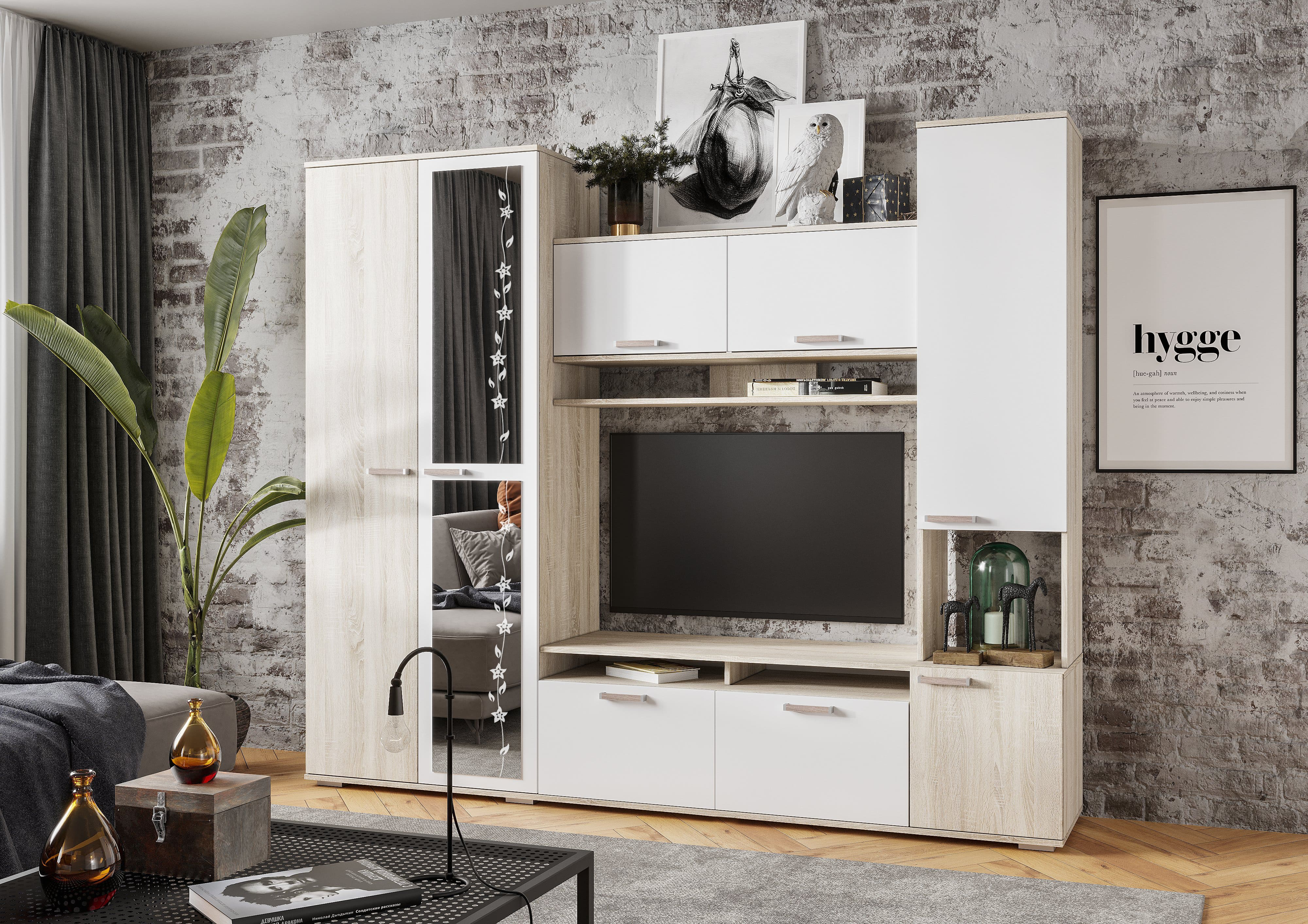 Компактный гарнитур «Лукас» – это функциональная стилизованная модель с простыми геометрическими формами и множеством полезного пространства. Контрастное сочетание фасадов белого цвета с древесной фактурой дуб сонома, а также отделка зеркалами станут ярким акцентом любого интерьера.