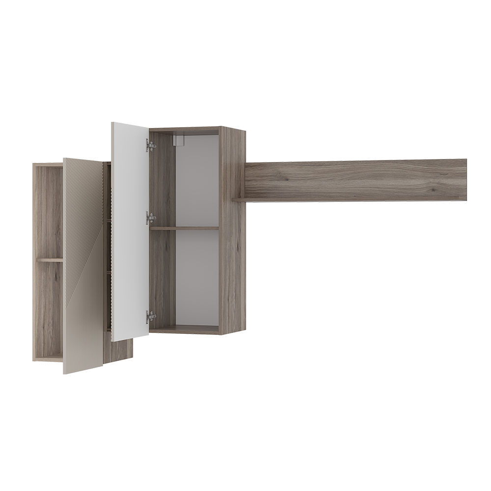 Гостиный модуль "Эмилия" ГМ-12 включает в себя ассиметричные шкафчики и длинную стильную рейку, что придает дизайну коллекции индивидуальность. В шкафчиках находится по две вместительных полки, а между ними расположены открытые узкие полки, которые идеально подойдут для хранения сувениров и элементов декора.