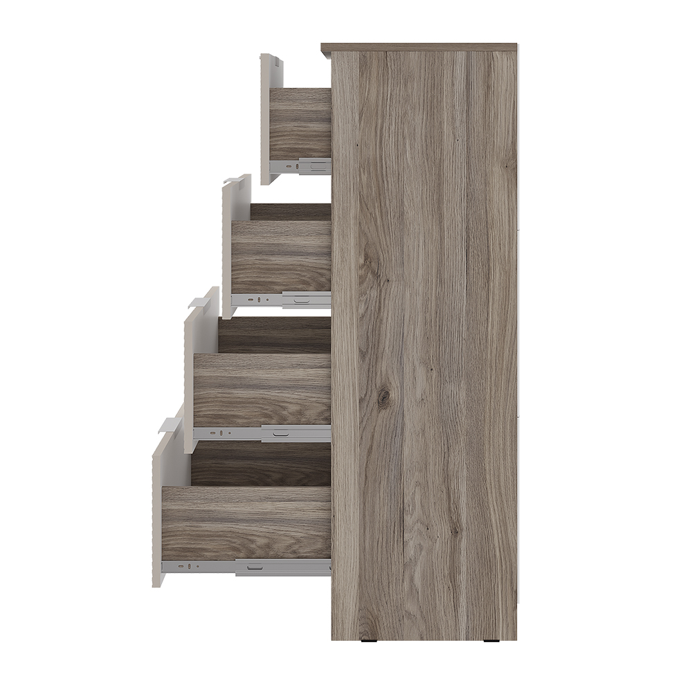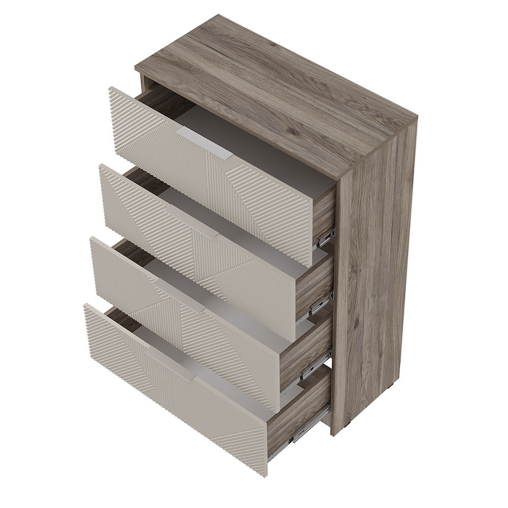 Комод "Эмилия" КМ-02 обладает четырьмя просторными ящиками для одежды и белья. Благодаря эргономичным фасадам открывание ящиков становится удобным и лёгким.