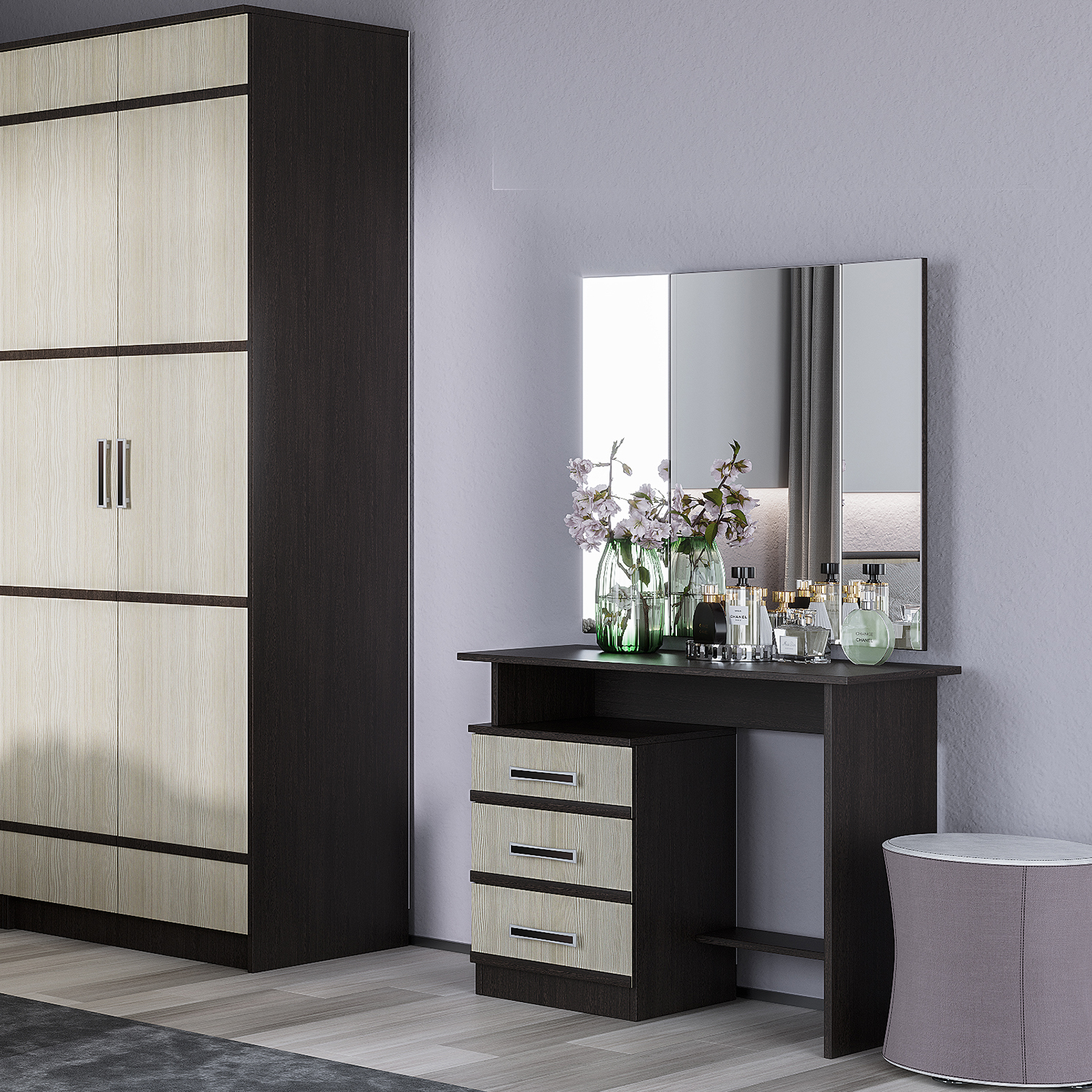 Лаконичный косметический стол "Сакура" выполнен в классическом сочетании цветов "венге" и "лоредо". Модель состоит из большого зеркала со складывающимися боковыми створками и тумбы с тремя выдвижными ящиками. Стол позволит разместить все необходимые предметы личной гигиены, косметические средства или украшения.