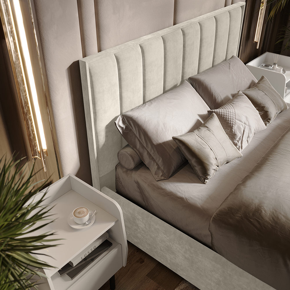 Изголовье, царги и изножье - это мягкие части кровати. Изголовье и изножье оформлены мягкими накладками, расцветка соответвует варианту исполнения. Ткань обивки - велюр.