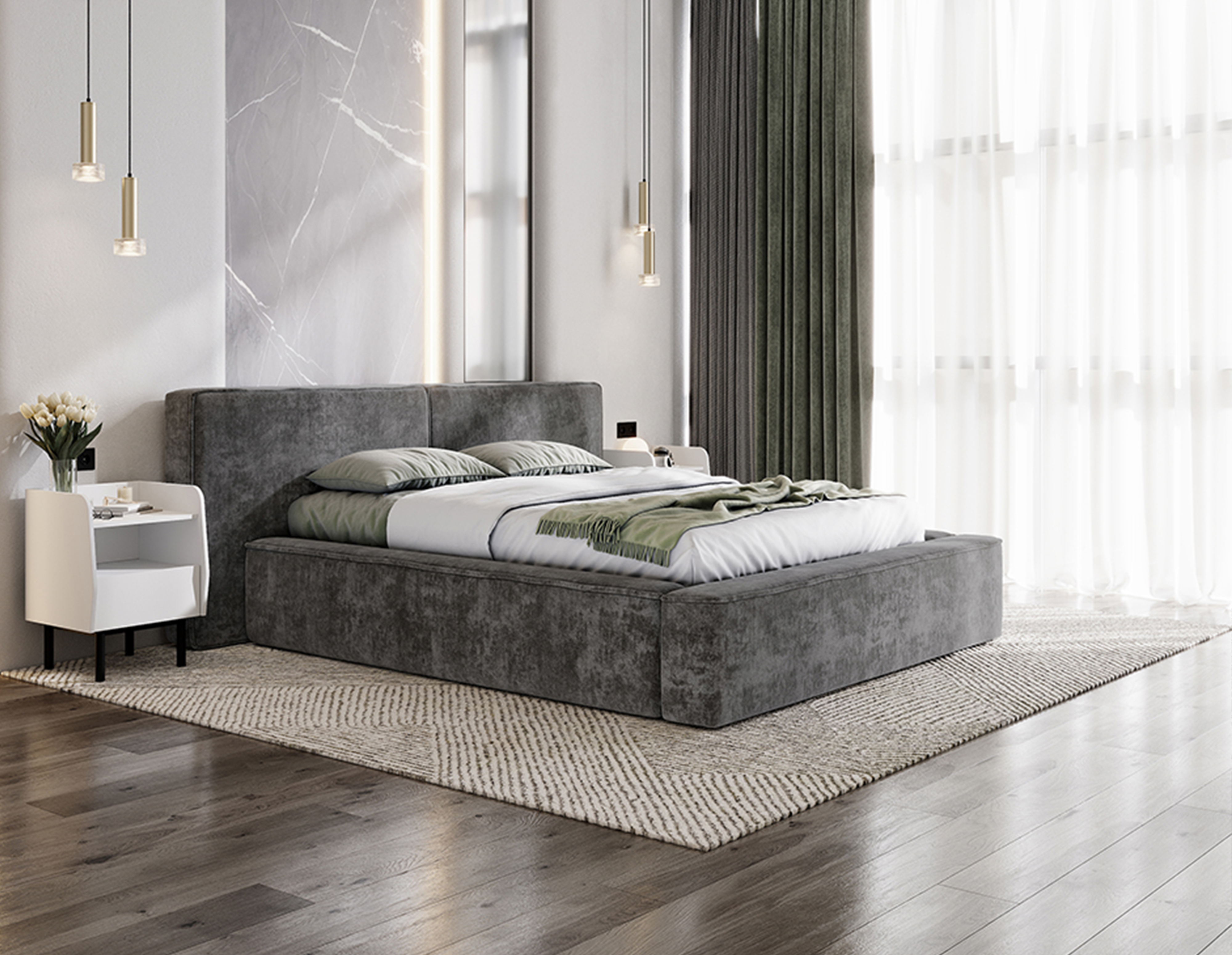 Материал мягких частей - велюр, искусственная замша. Декор изголовья и изножья - элегантный кант.