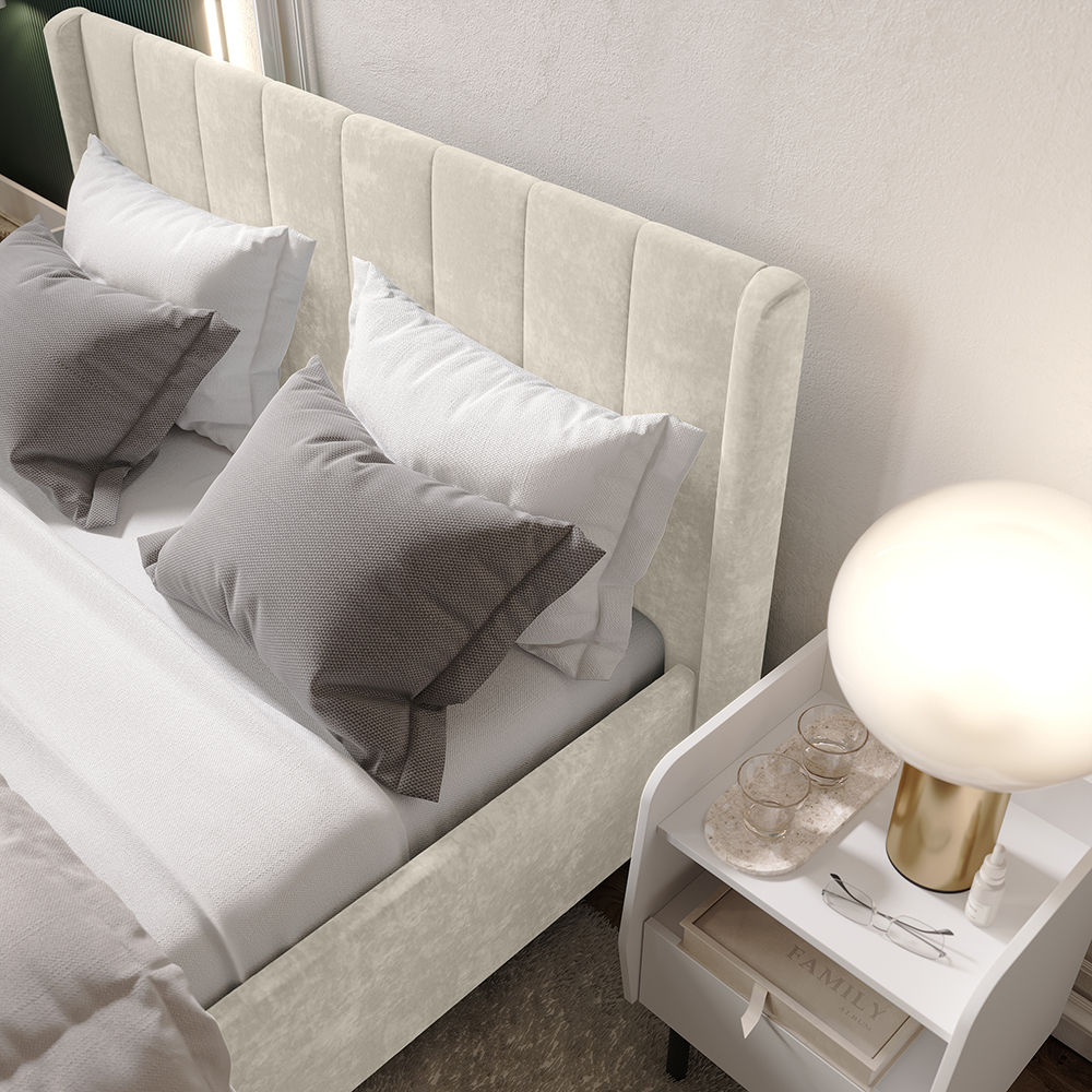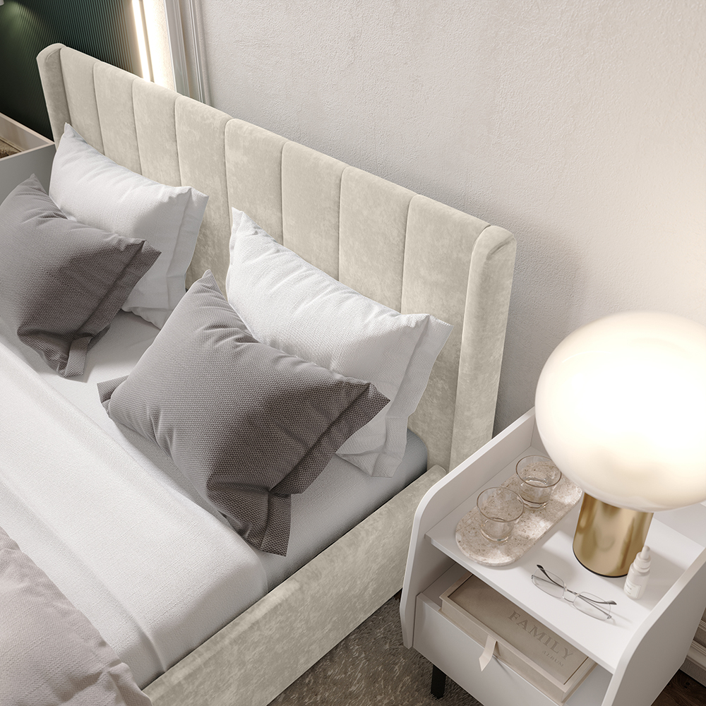 Материал мягких частей - велюр, задняя сторона - спанбонд серый. Декор изголовья - стежка.