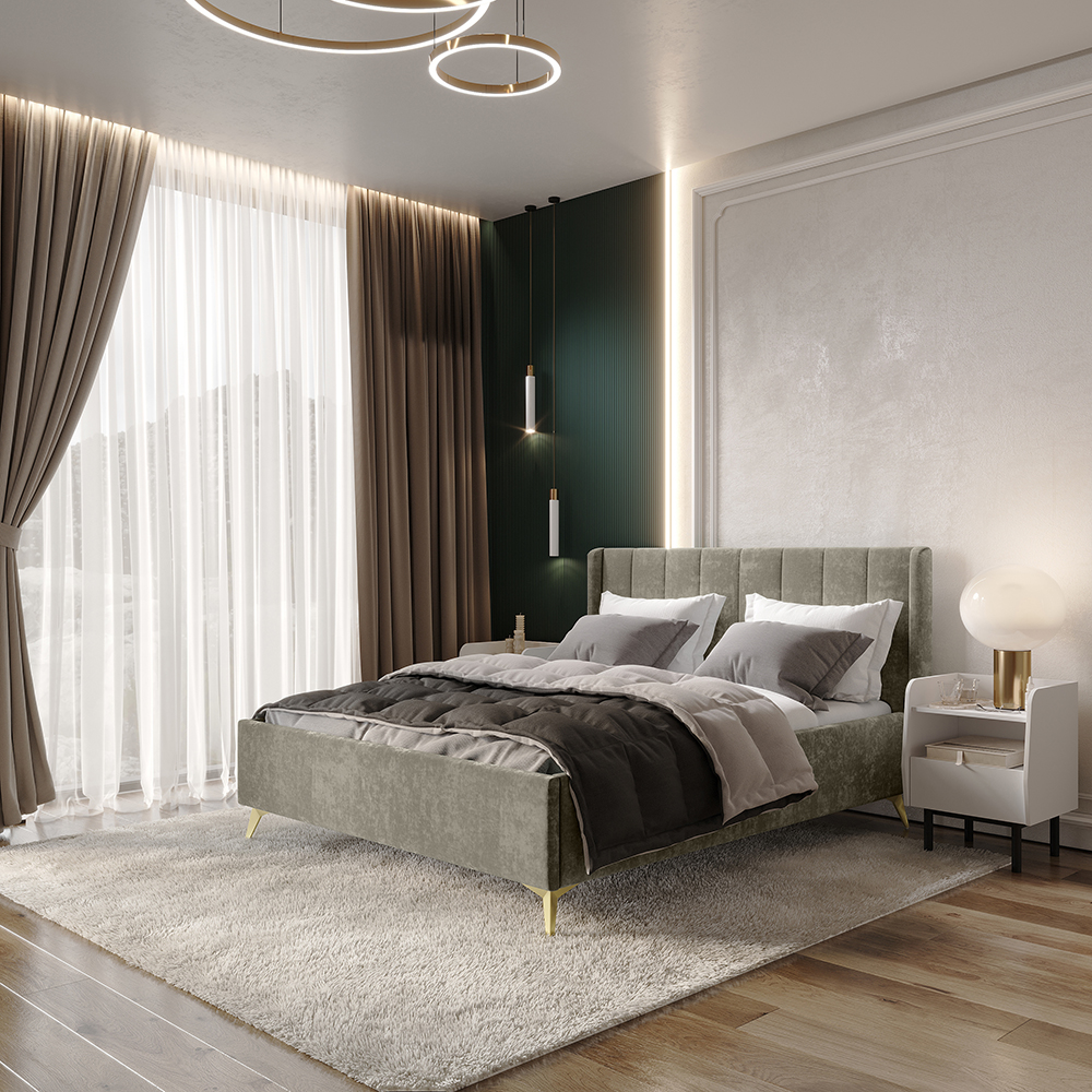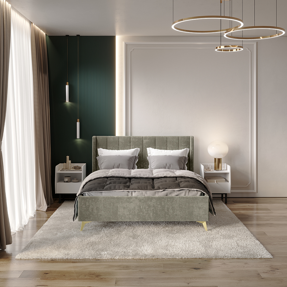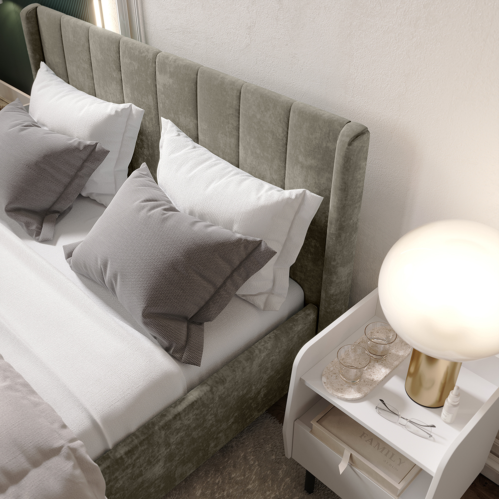Материал мягких частей - велюр, задняя сторона - спанбонд серый. Декор изголовья - стежка.