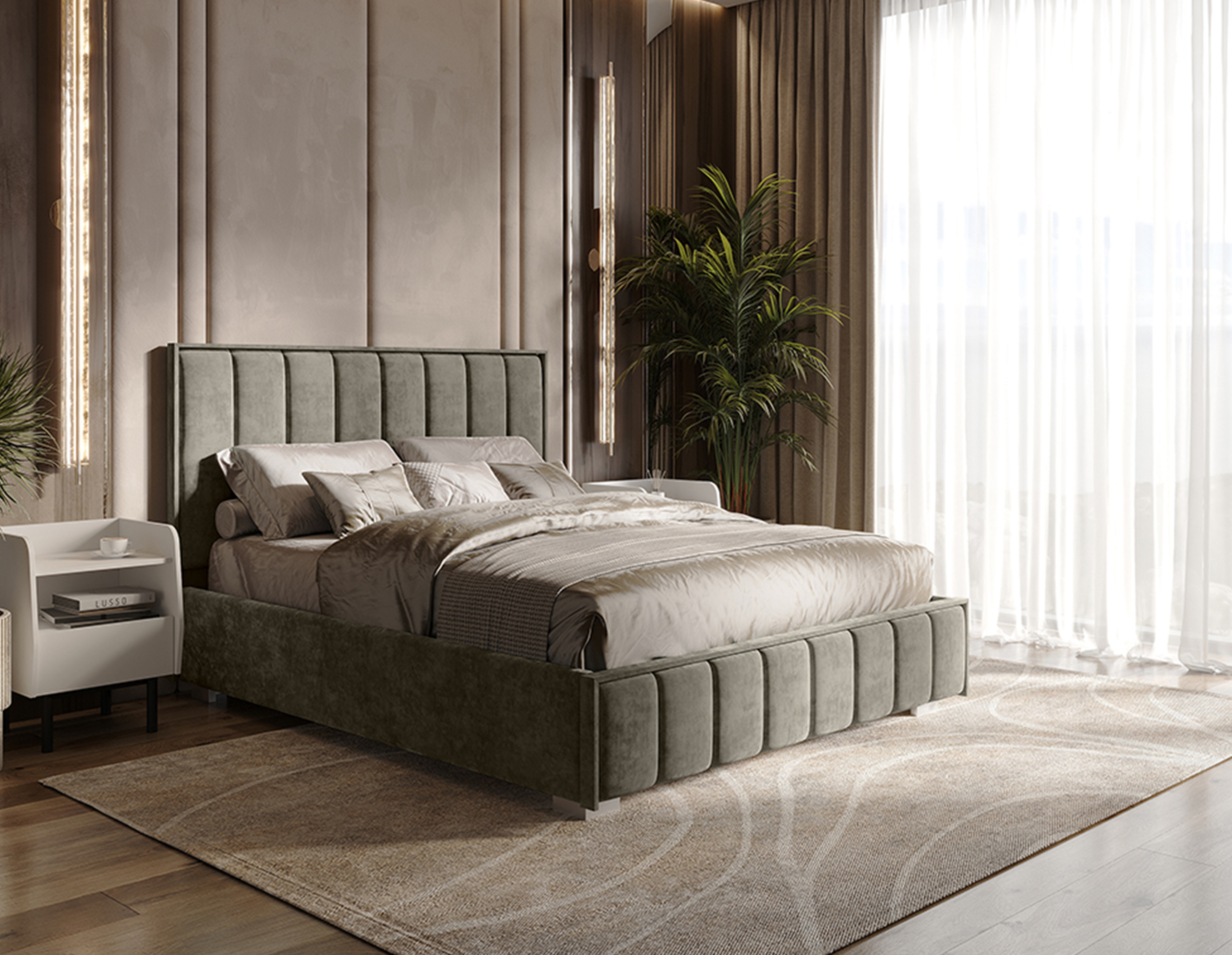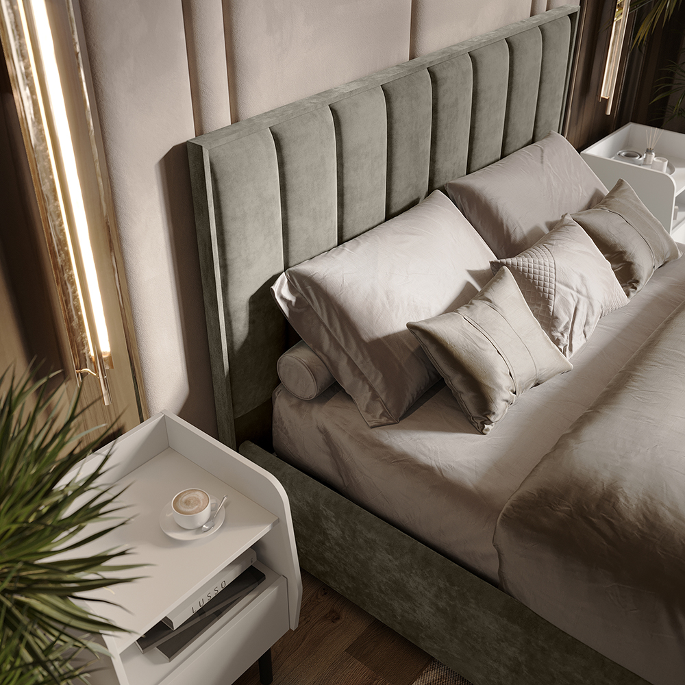 Изголовье, царги и изножье - это мягкие части кровати. Изголовье и изножье оформлены мягкими накладками, расцветка соответвует варианту исполнения. Ткань обивки - велюр.