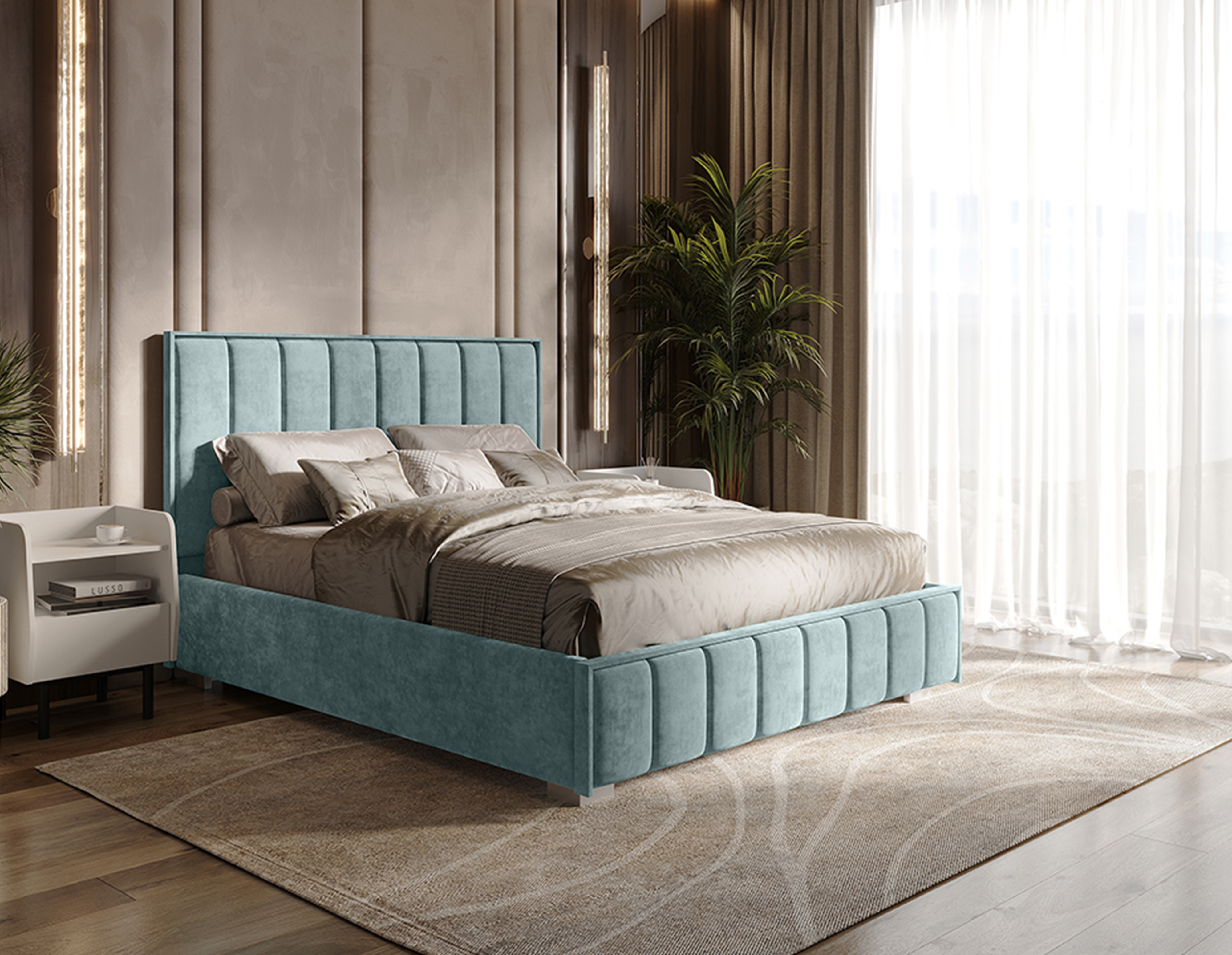 Изголовье, царги и изножье - это мягкие части кровати. Изголовье и изножье оформлены мягкими накладками, расцветка соответвует варианту исполнения. Ткань обивки - велюр.