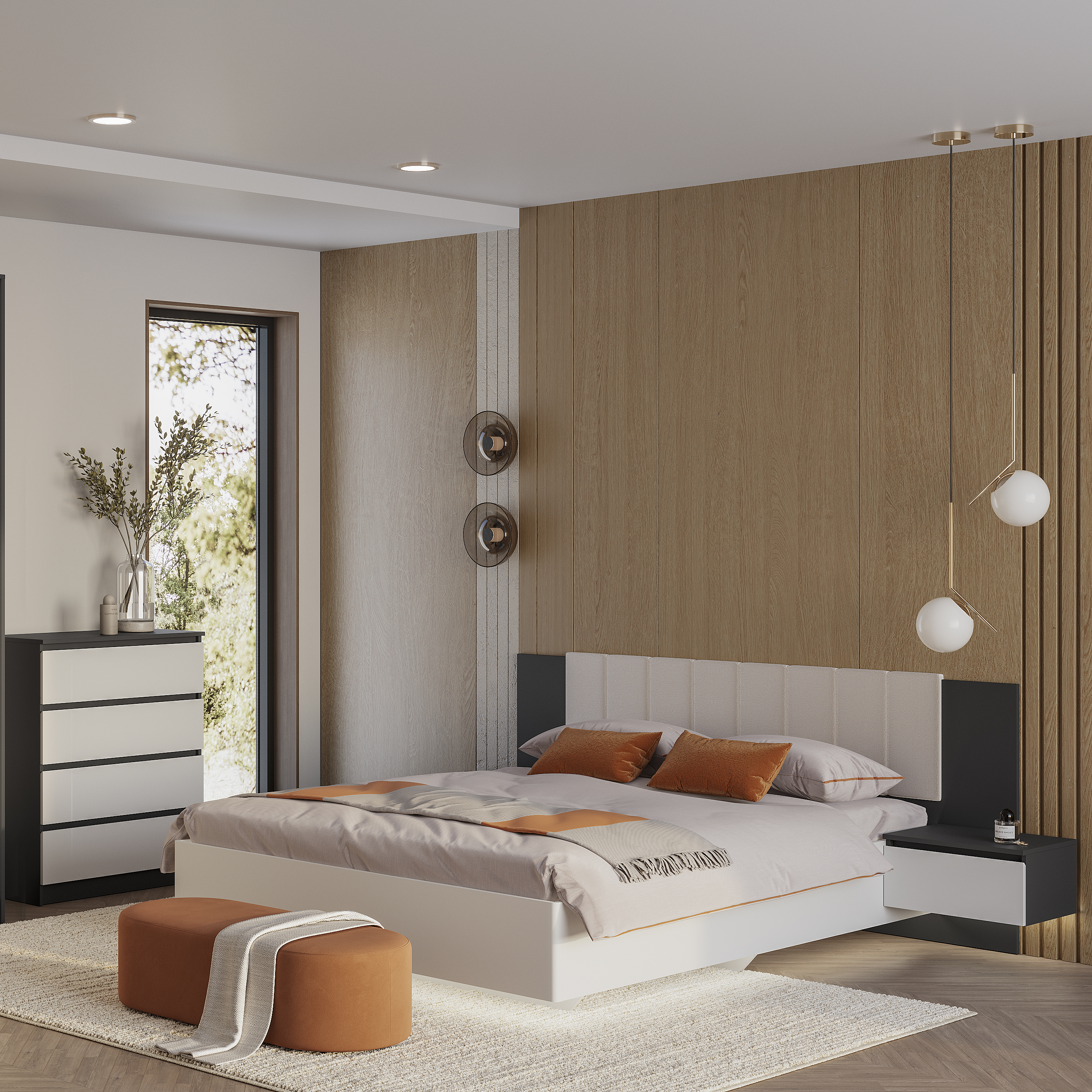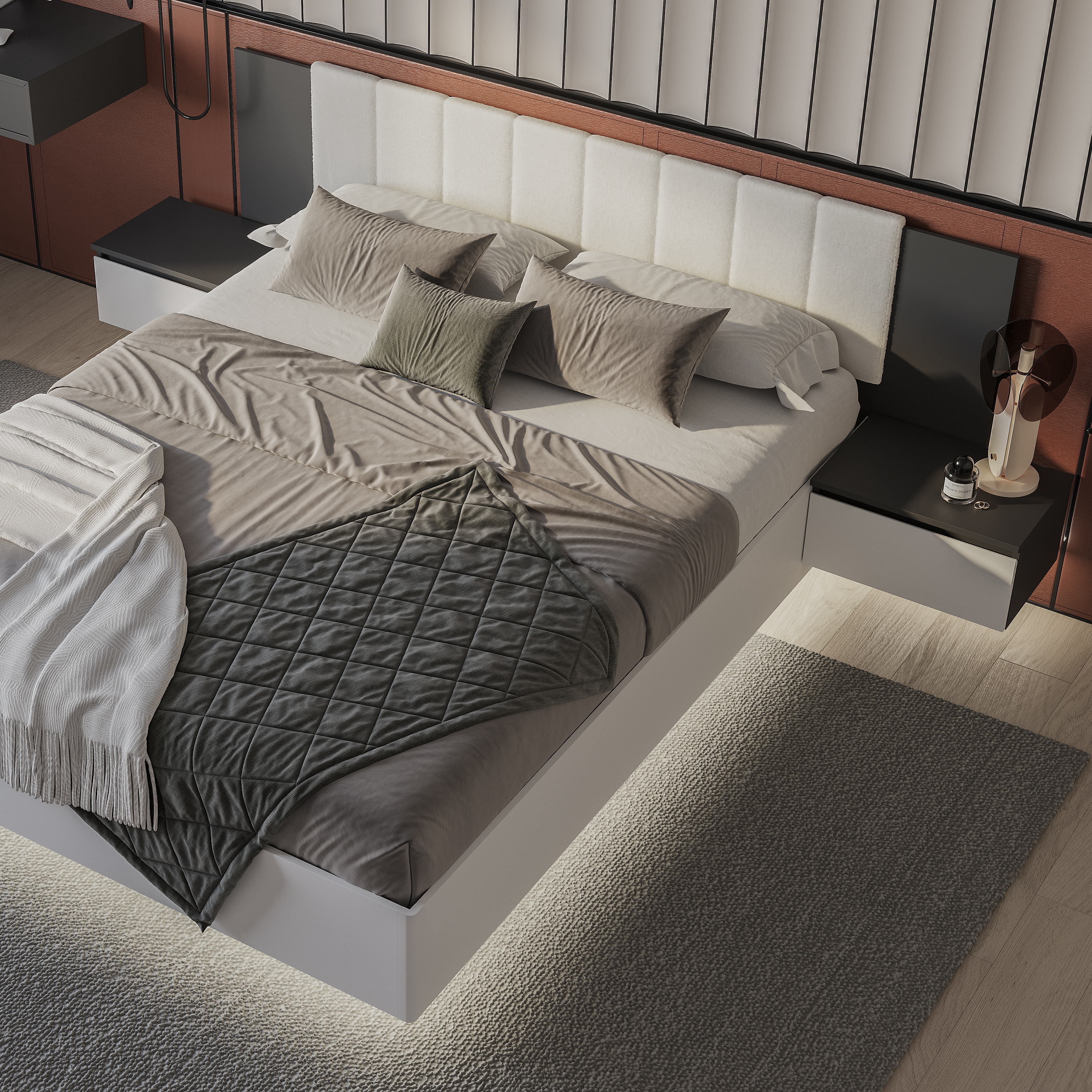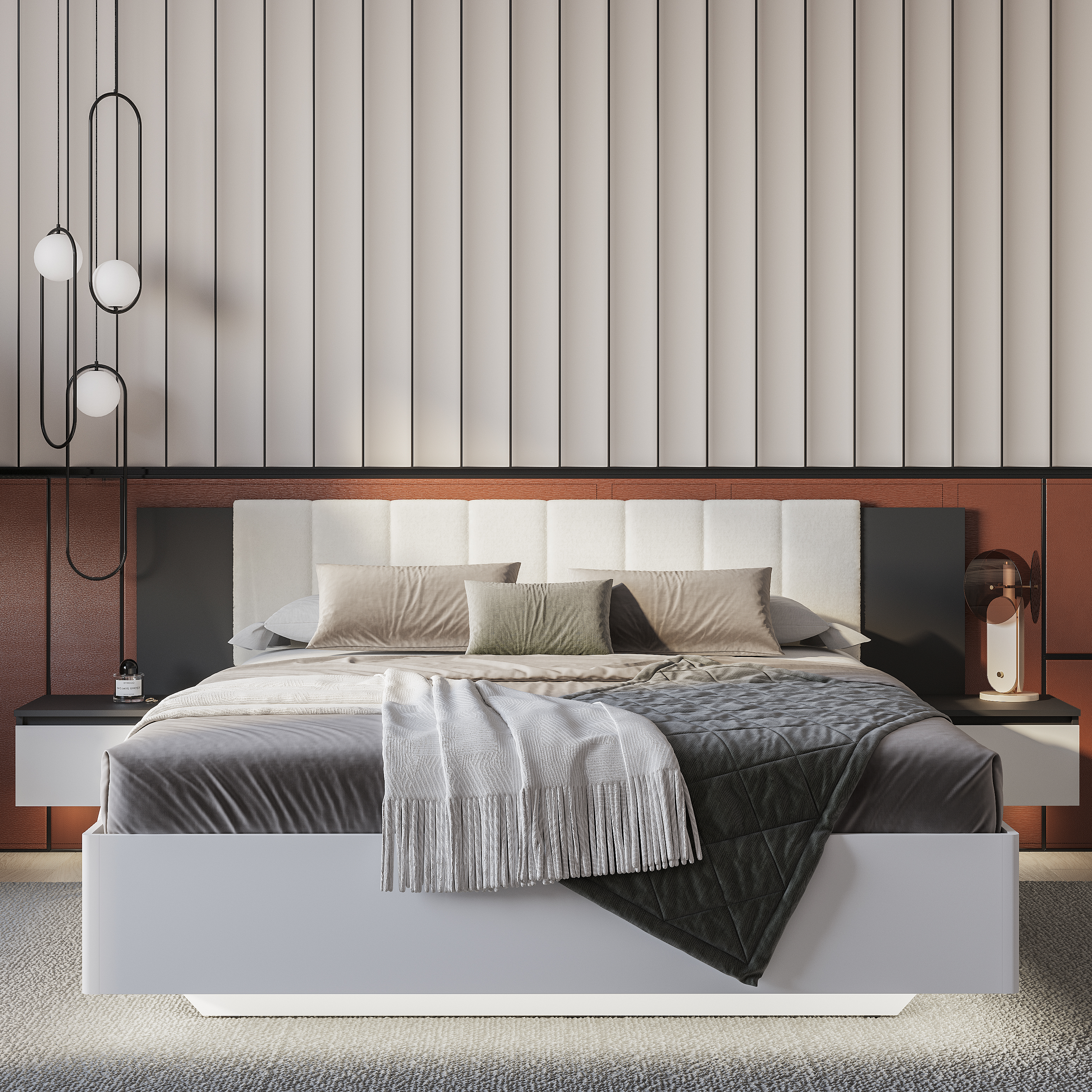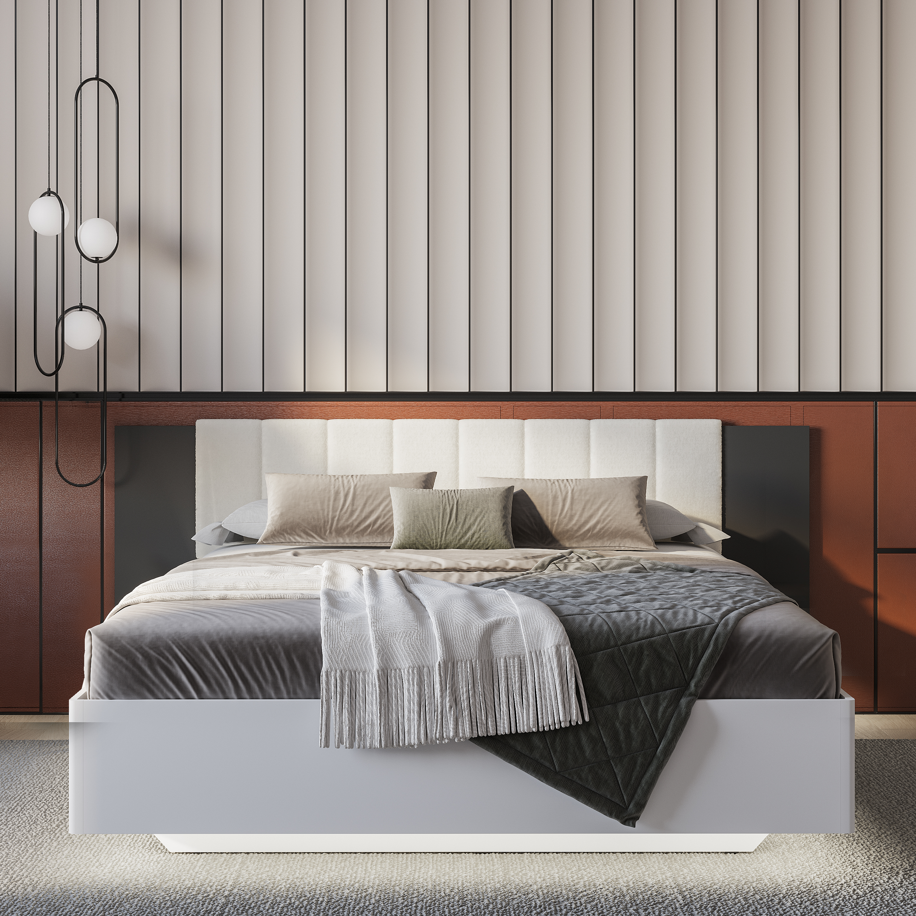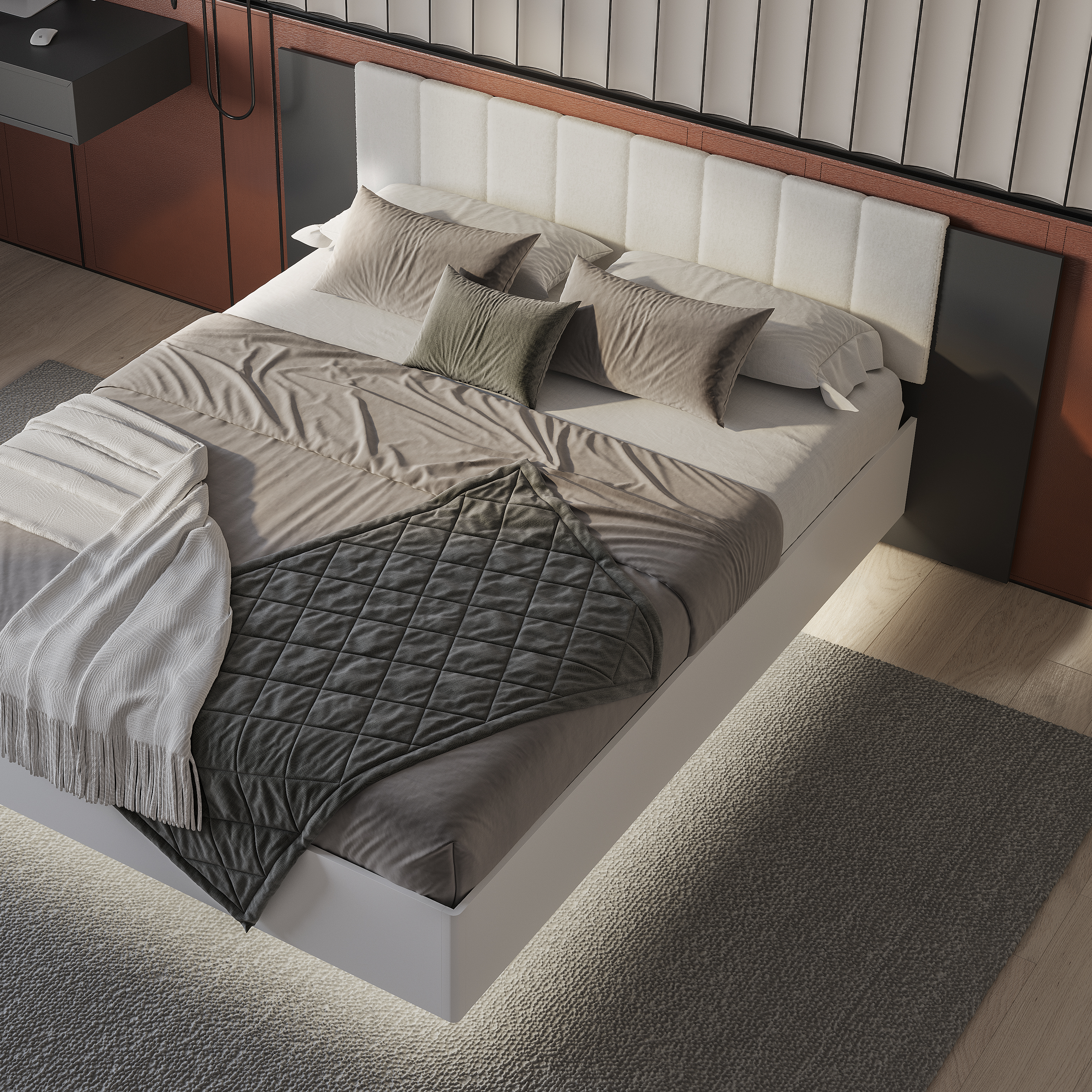 Коллекция "Шарм" - современная классика в контрастном исполнении "белый/графит". Кровать с парящим эффектом в трендовой ткани "барашек" - сердце коллекции. Настил, проложки и ортопедическое основание с подъемным механизмом приобретаются отдельно.