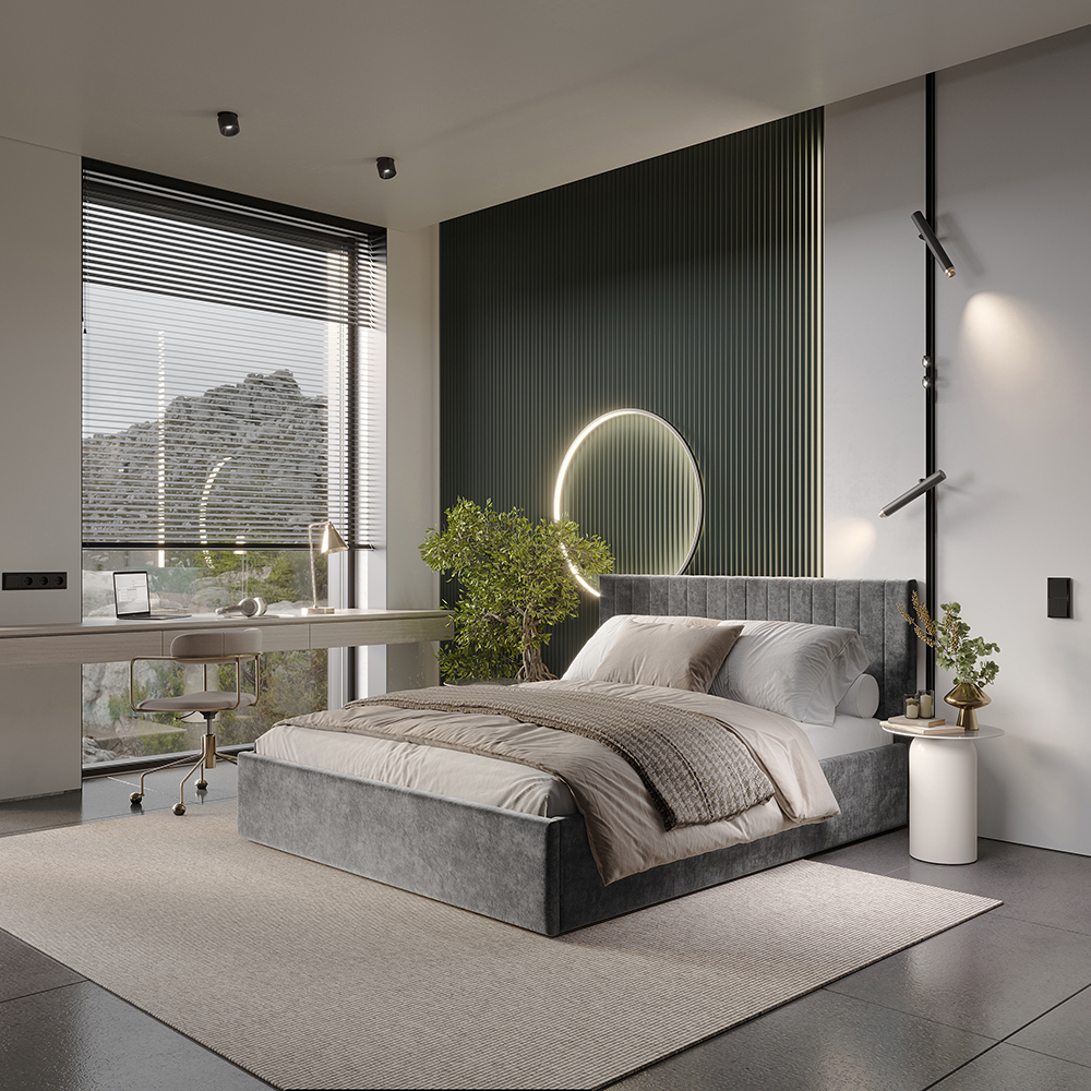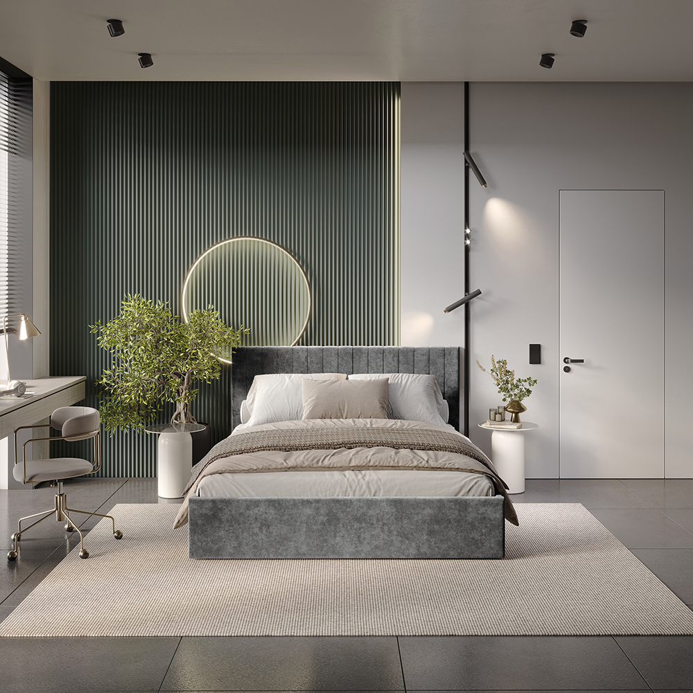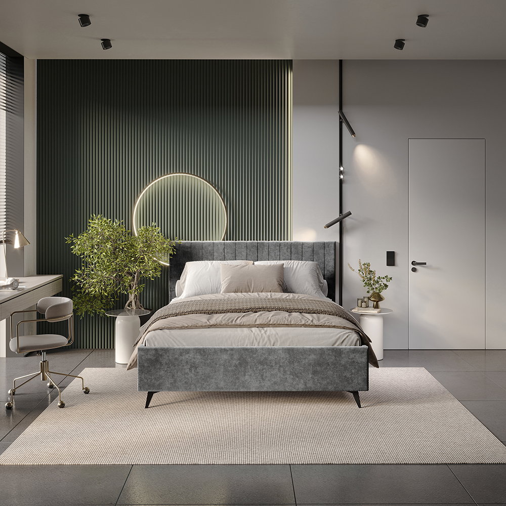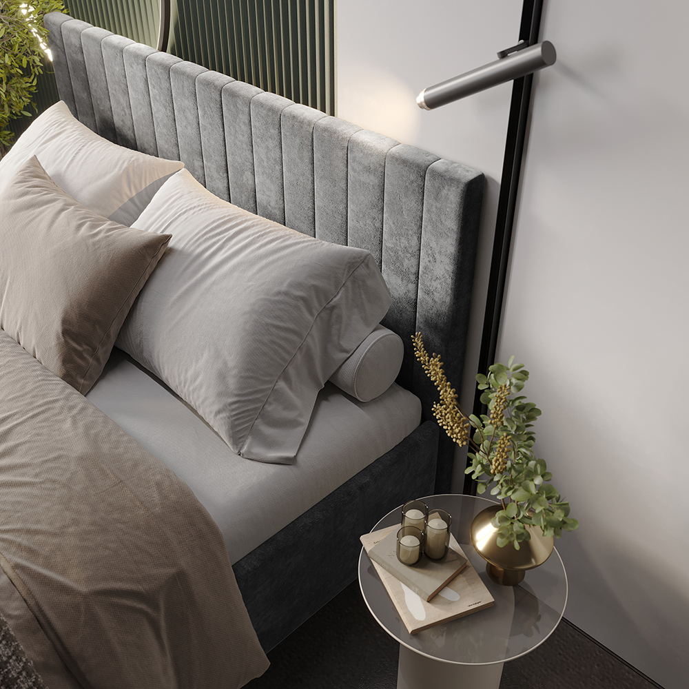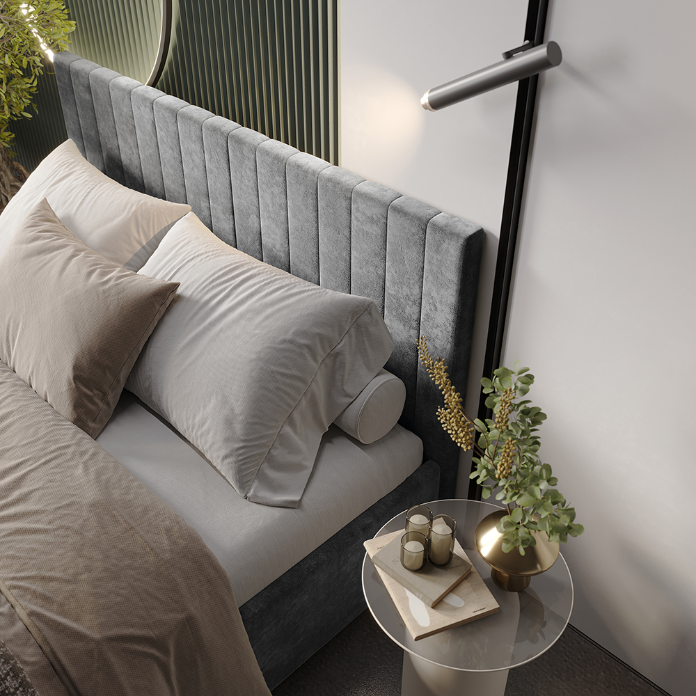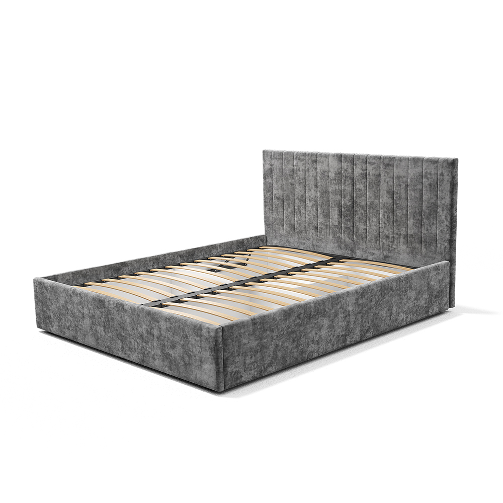 Материал мягких частей (изголовье, царги, изножье) - велюр, поролон; задняя сторона - спанбонд серый. Поролон: мягкое изголовье - 20 мм, изножье - 30 мм, царги - 20 мм. Декор изголовья - стежка.