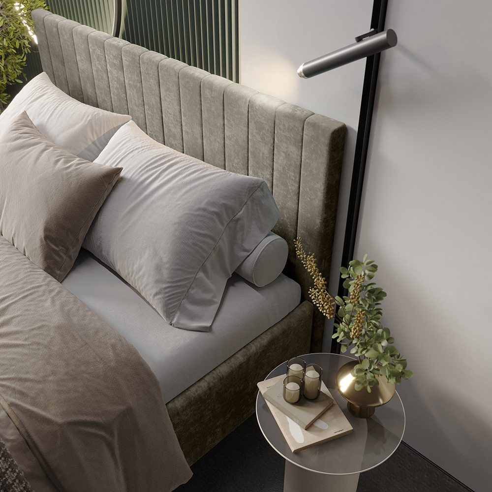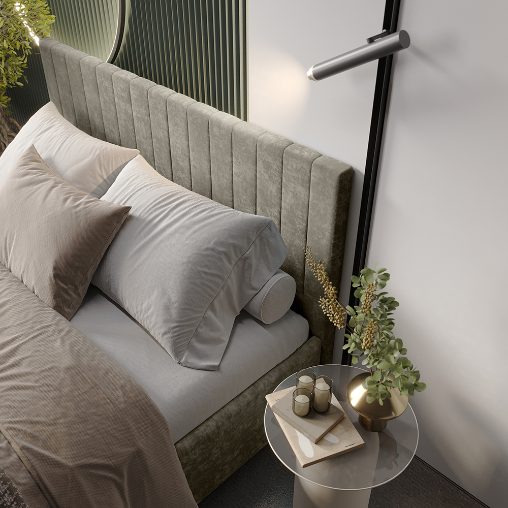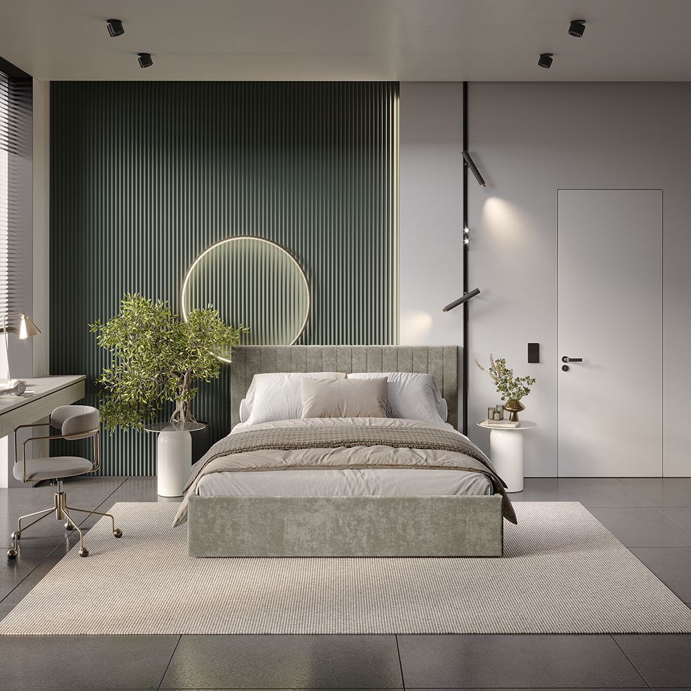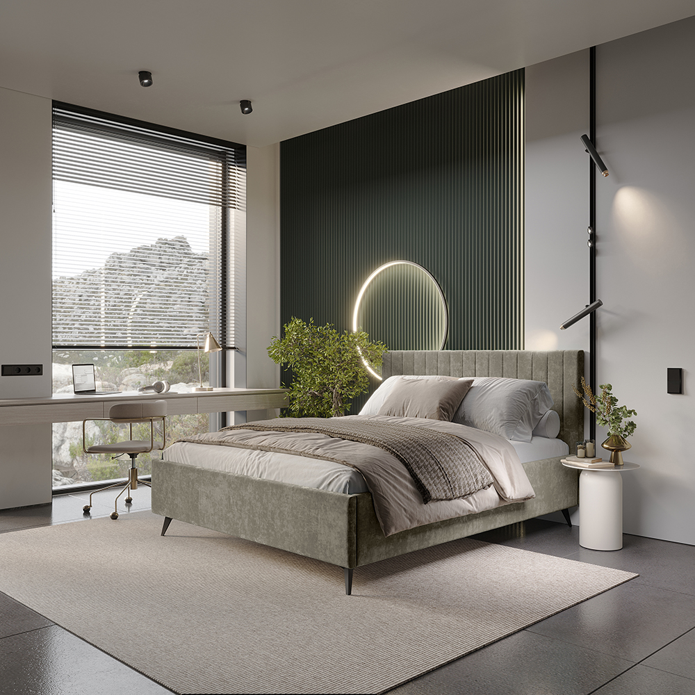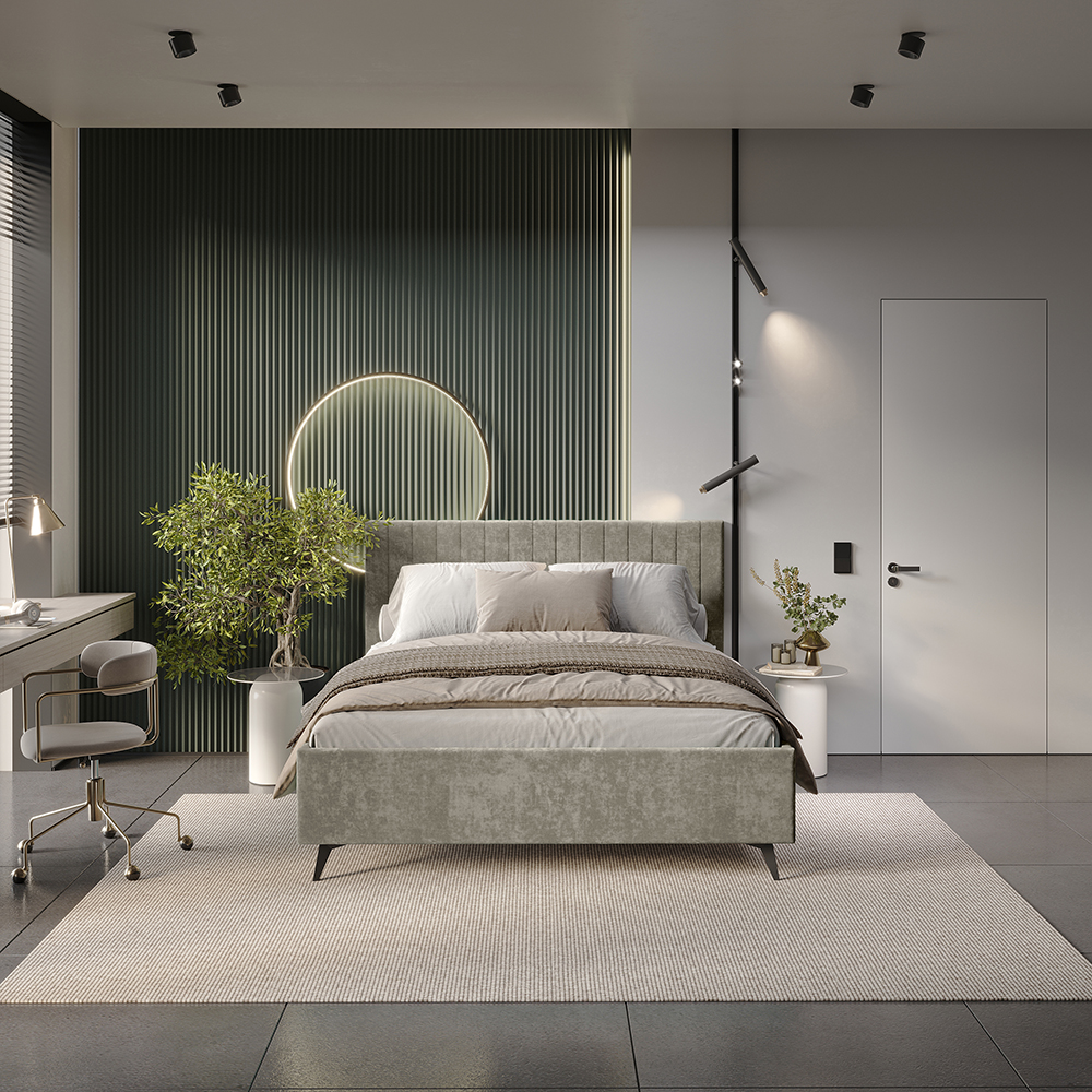 Материал мягких частей (изголовье, царги, изножье) - велюр, поролон; задняя сторона - спанбонд серый. Поролон: мягкое изголовье - 20 мм, изножье - 30 мм, царги - 20 мм. Декор изголовья - стежка.