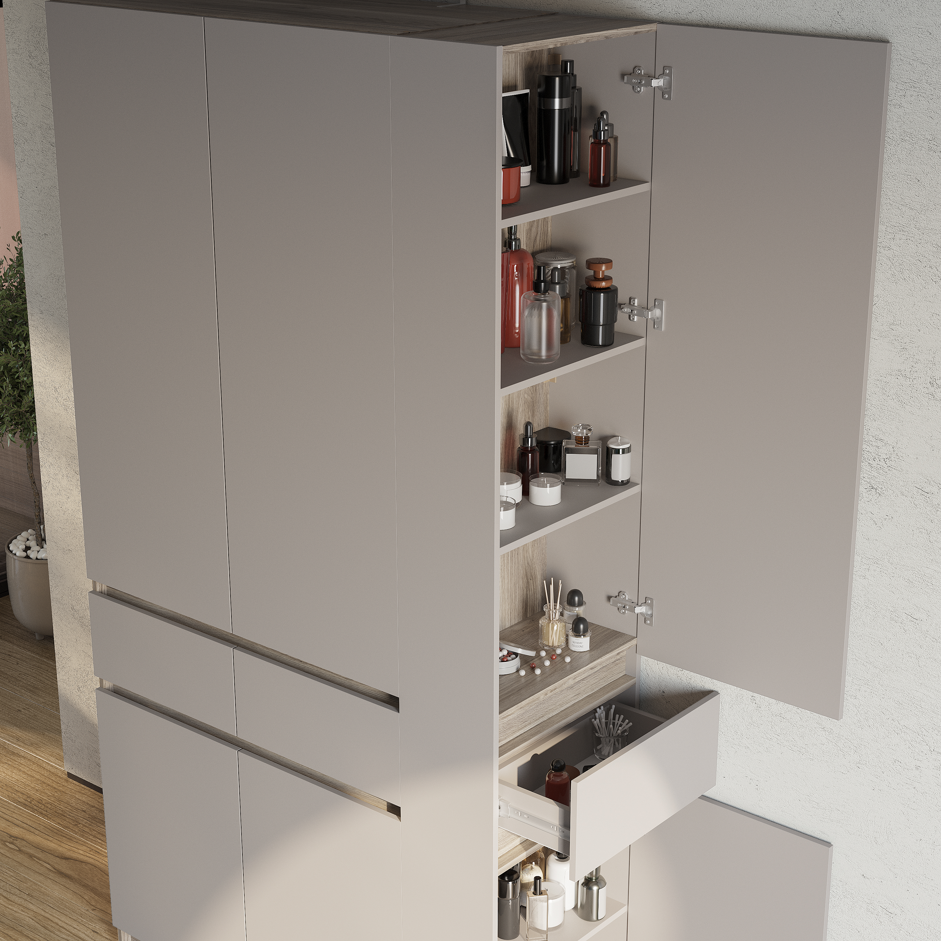 Петли створок – накладные с доводчиком/без доводчика. Максимальная нагрузка на полку – 10 кг, на штангу – 5 кг, на ящик – 5 кг.