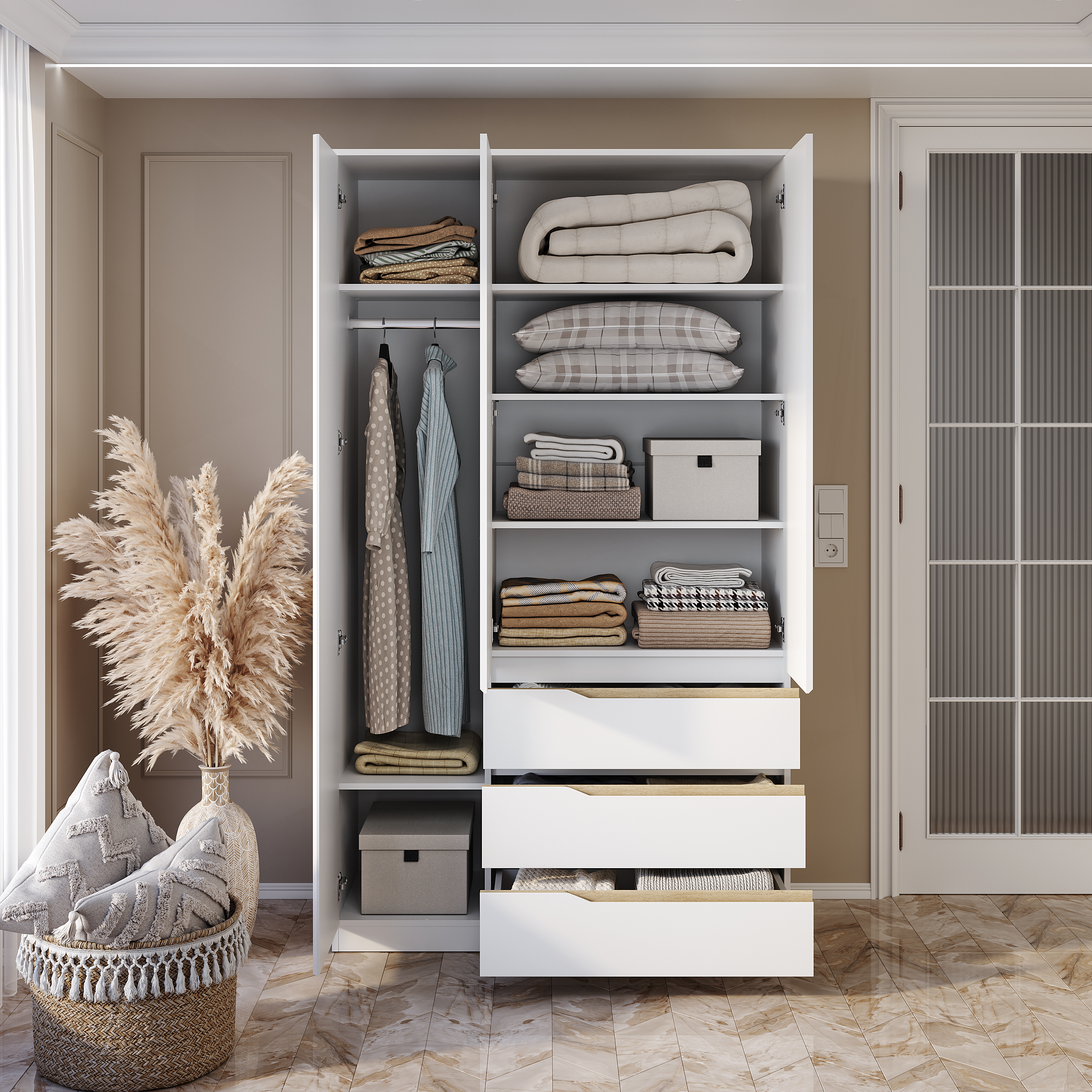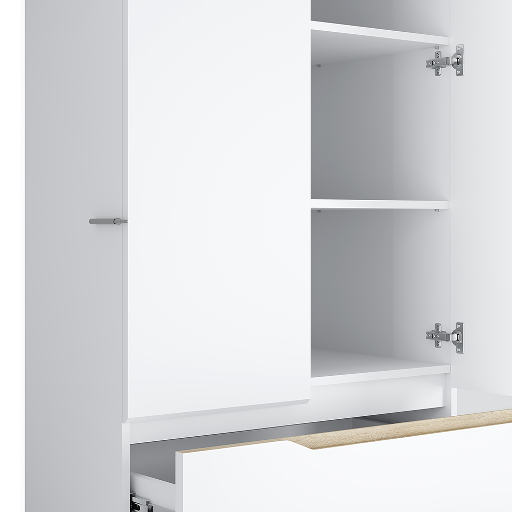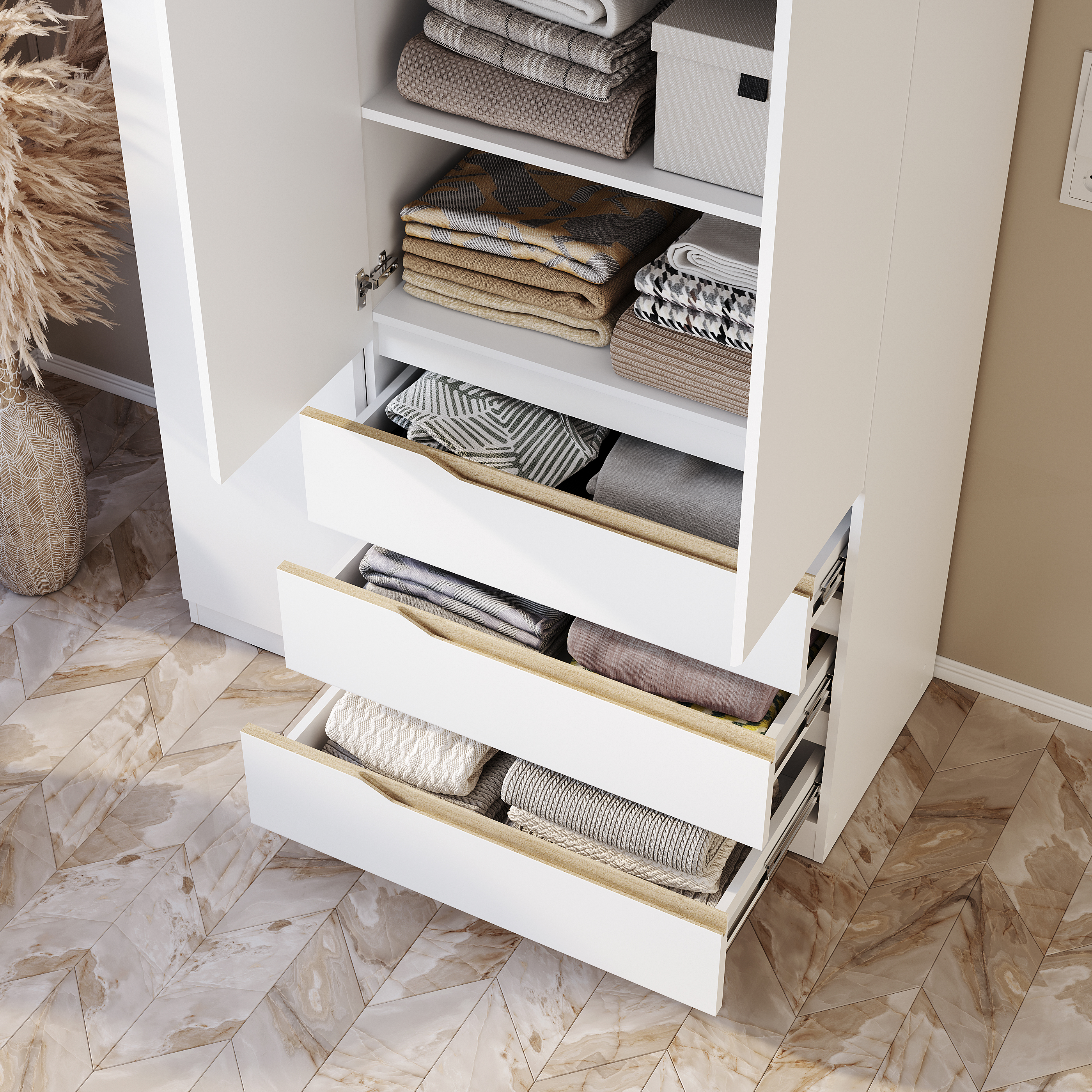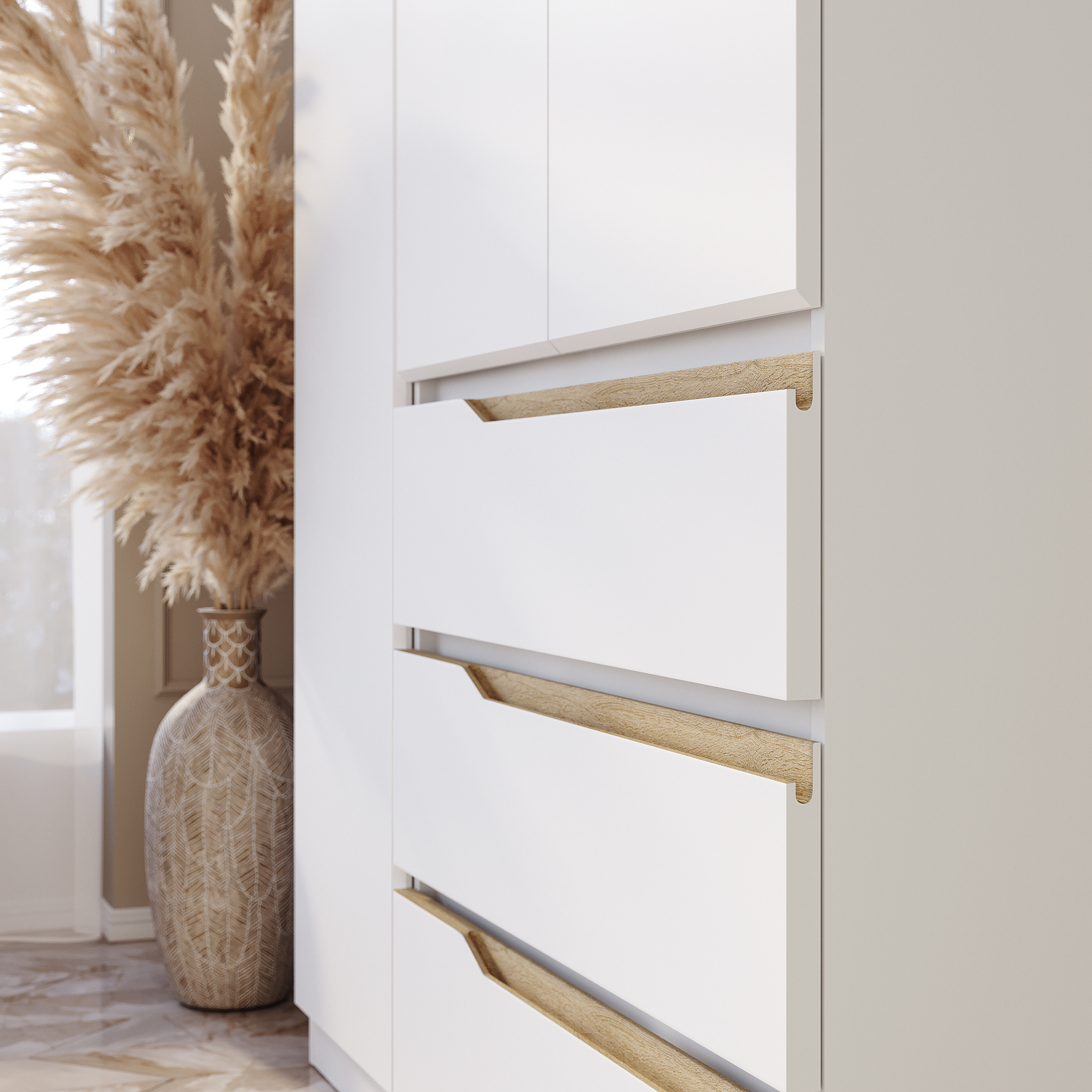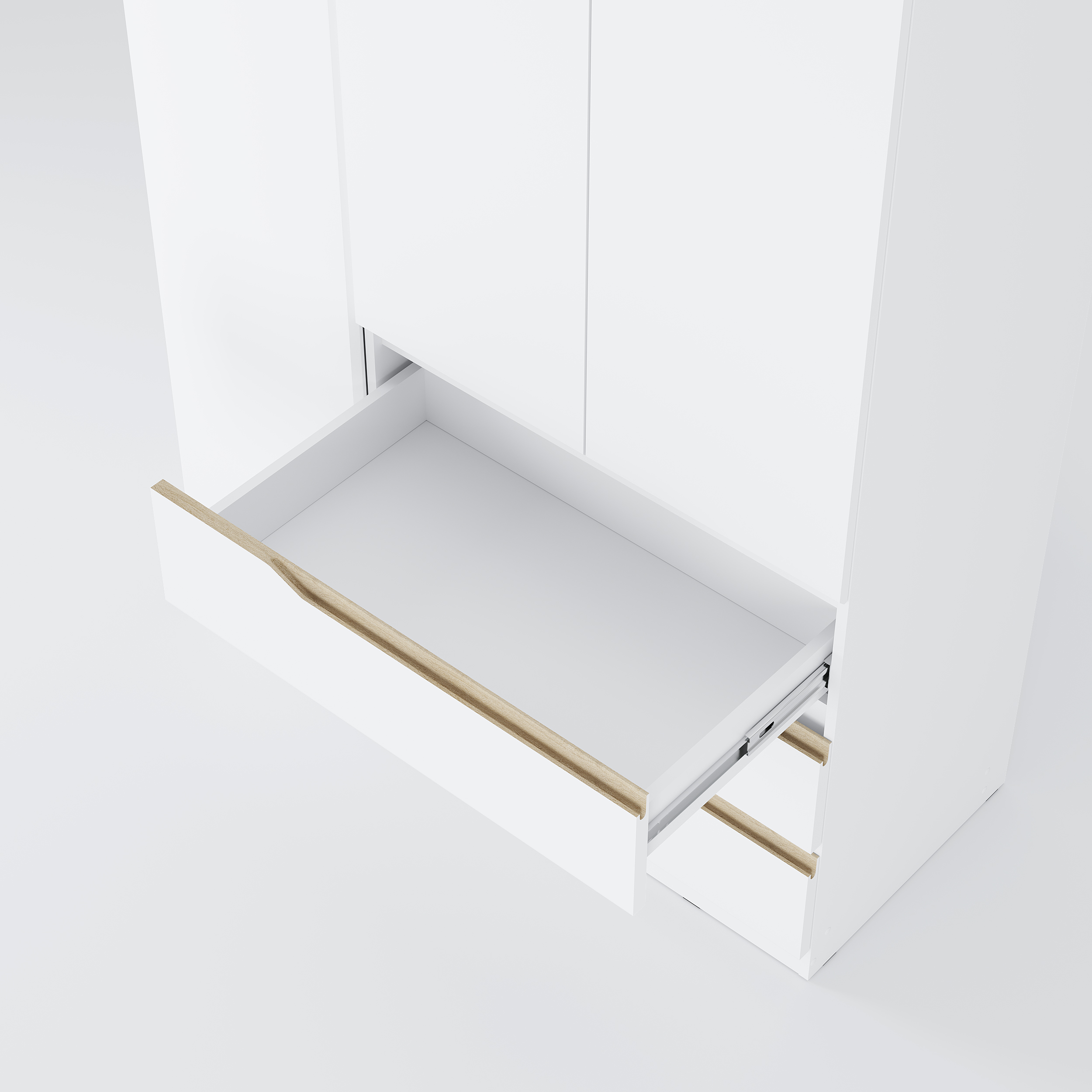Ящики открываются при помощи интегрированной ручки, большая створка – толкателем, малые створки – за счёт утопленной планки.