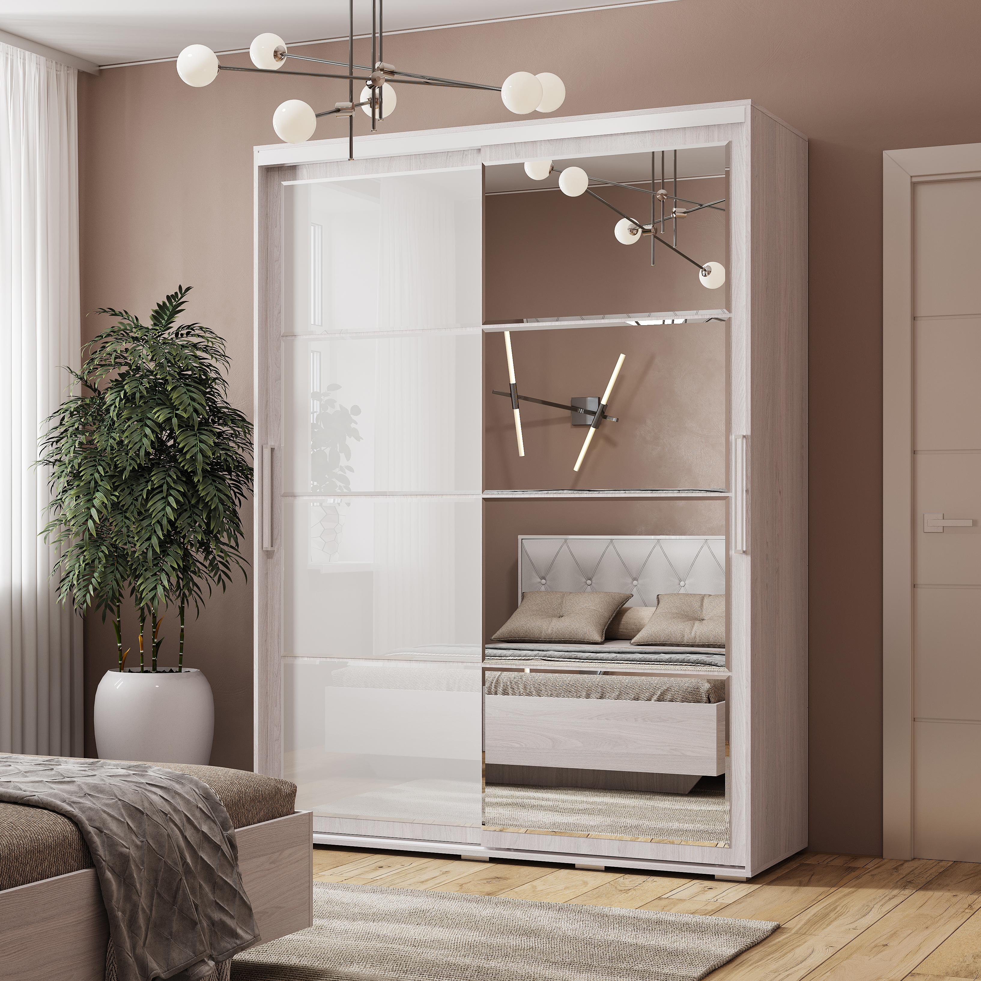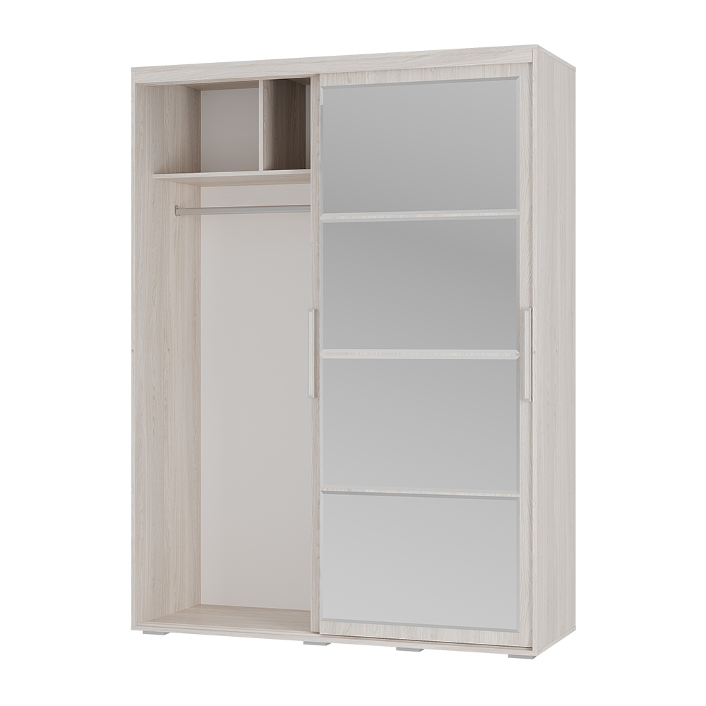 Шкаф-купе "Крафт-6" 1,6 м вписывается даже в небольшое пространство комнаты благодаря оптимальным габаритам. Вместе с тем позволяет грамотно организовать систему хранения не только одежды, но и необходимых в быту вещей. Шкаф "Крафт-6" - это сочетание удобства, экономичности и вкуса. Система хранения шкафа включает в себя отделение для хранения, два ящика, антресоль и плательный отсек. В оформлении левой створки шкафа присутствуют зеркала во весь рост, что изменяет восприятие пространства комнаты, создает объем и глубину. Оригинальный дизайн правой створки с использованием стекла лакобель подчеркивает игру света и тени, а также придает необычную передачу движения находящихся в комнате людей. Универсальность шкафа позволяет осуществлять сборку как на правую, так и на левую сторону. Плательный отсек с овальной хромированной штангой длиной 772 мм организуют удобное хранение достаточно большого количества одежды на вешалках.