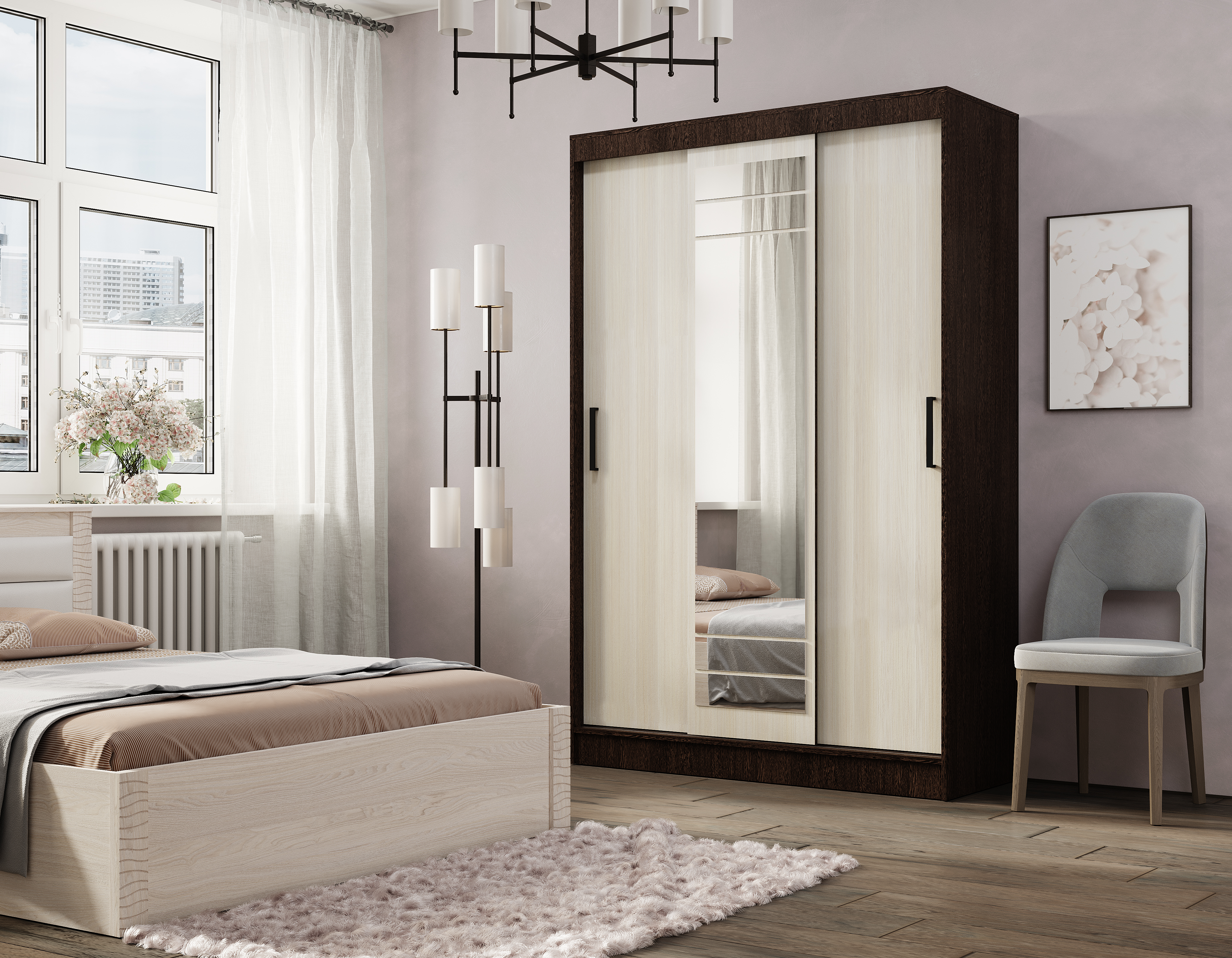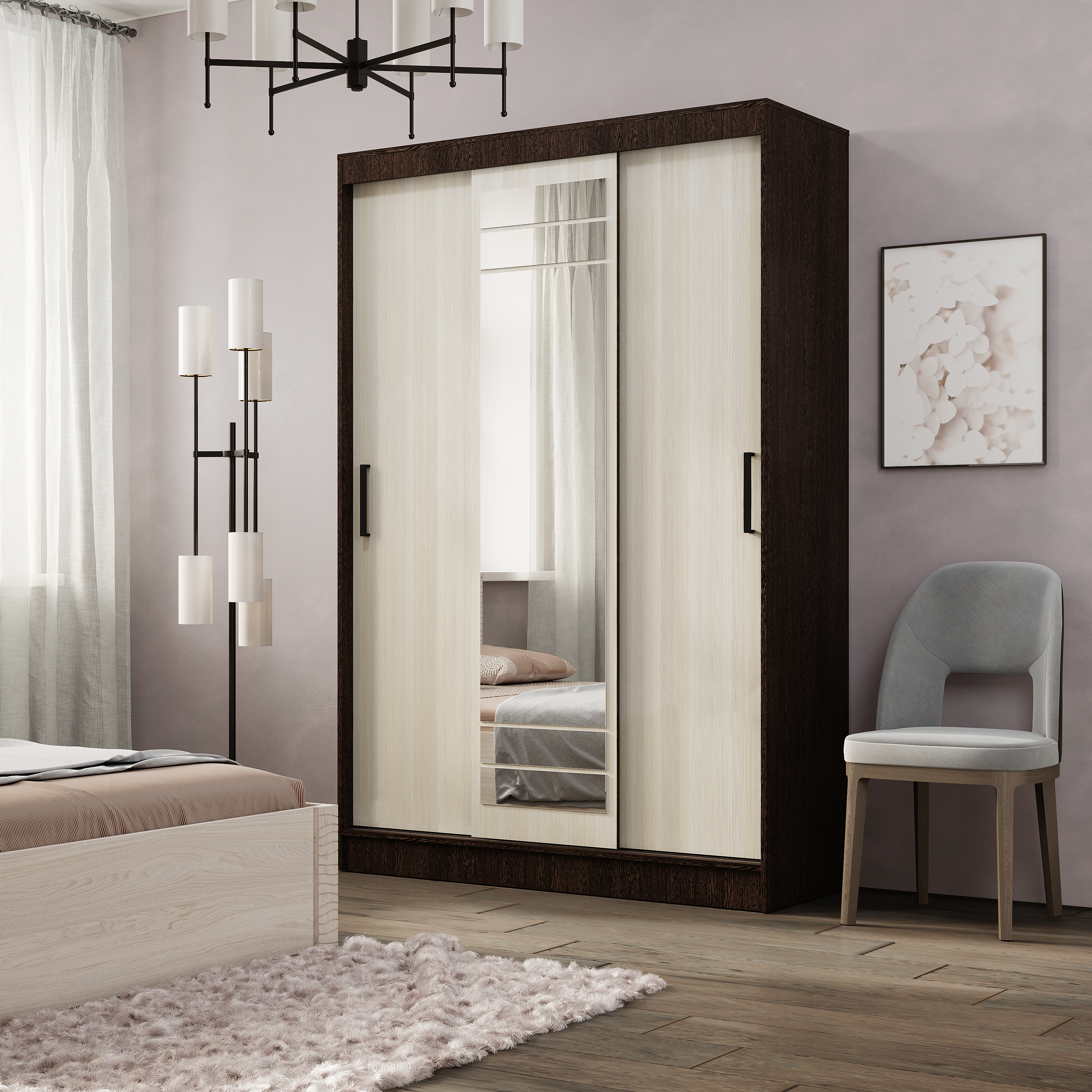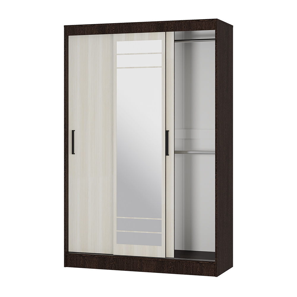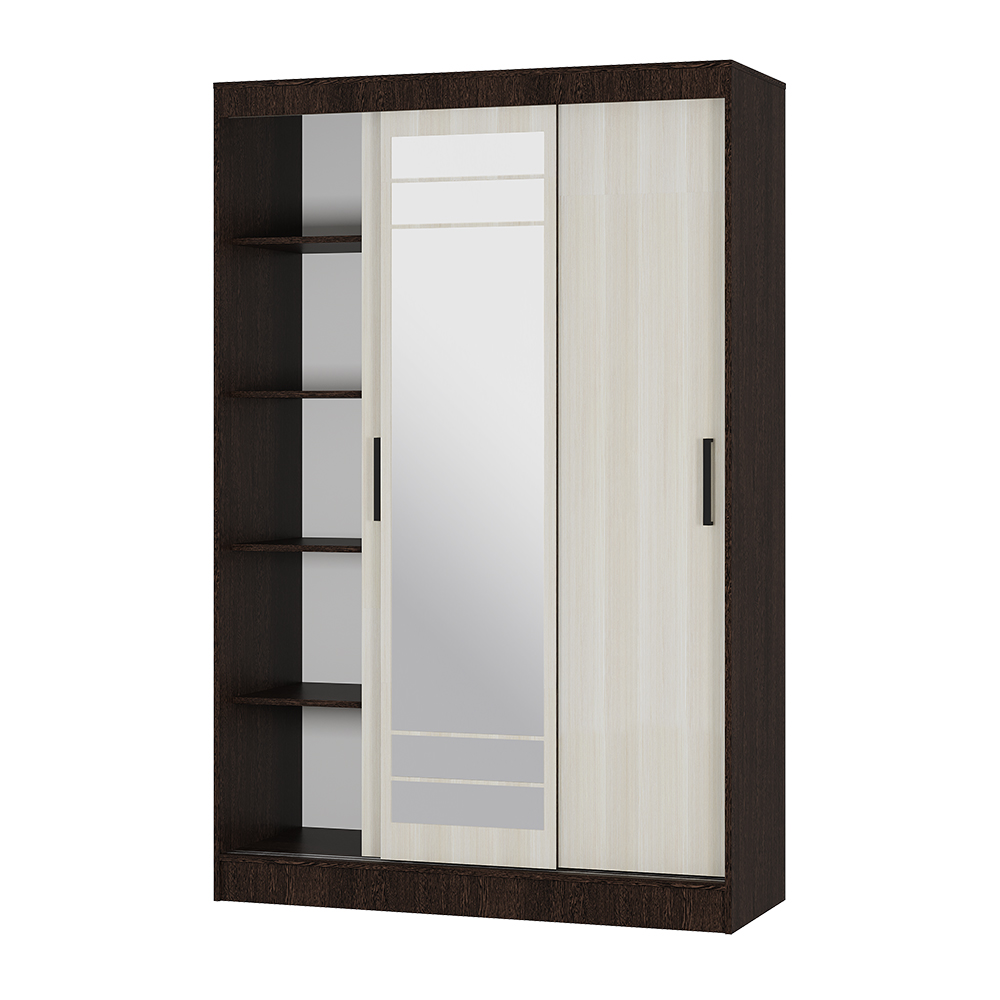 Трёхдверный шкаф-купе "Тео" ШКК-02 представляет собой сочетание практичности и функциональности. Это оптимальный вариант с точки зрения эргономики пространства. Раздвижные створки снабжены удобными ручками, центральная створка полностью декорирована зеркалом с еврокромкой, которое создаёт иллюзию расширенного пространства. Внутри с одной стороны находятся пять просторных полок для хранения вещей и постельного белья, с другой стороны – вместительная зона хранения с двумя горизонтальными хромированными штангами для одежды на вешалках.