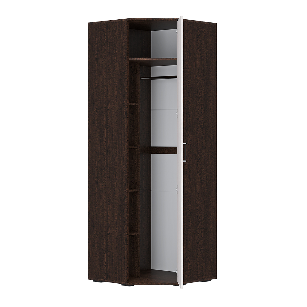 В угловом шкафу "Белла" из одноименной модульной серии можно разместить большой гардероб. В комплектацию входит отделение с хромированной штангой для вешалок, несколько полок для хранения белья и вещей, а также вместительная верхняя полка.